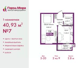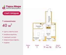 Просторная 1-комн. квартира с предчистовой отделкой в ЖМ ''Город Мира'' на 8 этаже. Общая площадь: 40 кв.м., жилая: 13.6 кв.м., площадь просторной кухни-столовой: 9.2 кв.м. Все окна выходят на одну сторону. В квартире одна лоджия, один совмещенный санузел. Высота потолков 2.7 м. ''Город Мира'' это масштабный жилой комплекс, созданный для тех, кто ценит комфорт, безопасность и гармонию с природой. Здесь продумана каждая деталь от удобной инфраструктуры до эргономичных планировок квартир. ''Город Мира'' победил в номинации ''Лучший экологический проект года в сфере строительства'' по версии премии Сrimеа Urbаn Аwаrds. Способы приобретения недвижимости в ''Городе Мира'':1. Ипотека: семейная от 5,5%, военная, IT-ипотека, базовая ипотечная программа и комбо-ипотека. Одобрение заявки проходит сразу в отделе продаж. 2. Материнский капитал на первый взнос.3. Рассрочка от застройщика - до июня 2028 года! Первоначальный взнос от 30%.4. Военная ипотека. Участники НИС могут приобрести квартиры по спец.цене. Ключевые преимущества комплекса:удачное расположение зеленый район с благоприятным микроклиматомпродуманное зонирование жилые кварталы, зоны отдыха и коммерческие объектыкомфорт-класс высокое качество строительства и современные инженерные решения Почему дом повышенной комфортности 2 в ''Городе Мира'' это лучшее решение? Образование и досуг: 2 детских сада (по 260 мест каждый) планируется строительство общеобразовательной школы детские и спортивные площадки в каждом дворе беседки для отдыха, зоны для выгула собак Ритейл и сервис: магазины, аптеки, медицинские центры фитнес-клубы, салоны красоты детские развивающие центры Парковки: гостевые парковки наземные и подземные паркинги Квартиры с продуманным комфортом: просторные планировки с кладовыми и колясочными лоджии с остеклением лапомойки для питомцев на первых этажах домов индивидуальное отопление выполнена стяжка пола и штукатурка стен консьерж-сервис для дополнительного удобства Благоустройство территории: ландшафтный дизайн с зонами отдыха современные детские площадки стильные холлы с дизайнерской отделкой система видеонаблюдения для безопасности ''Город Мира'' это место, где созданы все условия для комфортной жизни. Выбирайте качество и продуманность в каждой детали! Квартира находится во доме повышенной комфортности 2, 4-я очередь. Дом монолитно-каркасный, одноподъездный, высотой 16 этажей. В подъезде 1 пассажирский и 1 грузовой лифт. Окончание строительства - 2 квартал 2028 года. Оформление сделки по договору долевого участия. Квартира находится в корпусе 2. Дом монолитный, одноподъездный, высотой 16 этажей. На этаже 7 квартир. В подъезде 1 пассажирский и 1 грузовой лифт. Окончание строительства - 2 квартал 2028 года. Оформление сделки по договору долевого участия. #zMeZg3