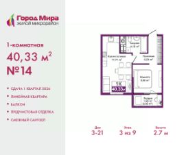 Просторная 1-комн. квартира с предчистовой отделкой в ЖМ ''Город Мира'' на 3 этаже. Общая площадь: 40.33 кв.м., жилая: 9.96 кв.м., площадь просторной кухни-столовой: 17.71 кв.м. Все окна выходят на одну сторону. В квартире один балкон, один совмещенный санузел. Высота потолков 2.7 м. Жилой комплекс ''Город Мира'' комфорт и гармония в современном формате. ''Город Мира'' это масштабный жилой комплекс, созданный для тех, кто ценит комфорт, безопасность и гармонию с природой. Здесь продумана каждая деталь от удобной инфраструктуры до эргономичных планировок квартир. В 2024 году микрорайон ''Город Мира'' победил в номинации ''Лучший экологический проект года в сфере строительства'' по версии премии Crimea Urban Awards. Ключевые преимущества комплекса:- удачное расположение зеленый район с благоприятным микроклиматом- продуманное зонирование жилые кварталы, зоны отдыха и коммерческие объекты- комфорт-класс высокое качество строительства и современные инженерные решения Инфраструктура ''Города Мира'': Образование и досуг:- 2 детских сада (по 260 мест каждый)- планируется строительство общеобразовательной школы- детские и спортивные площадки в каждом дворе- беседки для отдыха, зоны для выгула собак Ритейл и сервис:- магазины, аптеки, медицинские центры- фитнес-клубы, салоны красоты- детские развивающие центры Парковки:- гостевые парковки- наземные и подземные паркинги Квартиры с продуманным комфортом:- просторные планировки с кладовыми и колясочными- лоджии с остеклением- автономное отопление (по 23 дому: индивидуальное отопление)- выполнена стяжка пола (по 3, 4, 20, 21, 22 домам: выполненная стяжка пола и штукатурка стен) - Консьерж-сервис для дополнительного удобства Благоустройство территории:- ландшафтный дизайн с зонами отдыха- современные детские площадки- стильные холлы с дизайнерской отделкой- система видеонаблюдения для безопасности ''Город Мира'' это место, где созданы все условия для комфортной жизни. Выбирайте качество и продуманность в каждой детали! Квартира находится в корпусе 3_21. Дом монолитный, одноподъездный, высотой 9 этажей. В подъезде 1 грузовой лифт. Окончание строительства - 1 квартал 2026 года. Оформление сделки по договору долевого участия. #2MmZUE