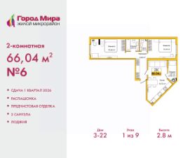 2-комн. квартира с предчистовой отделкой в ЖМ ''Город Мира'' на 1 этаже. Общая площадь: 66.04 кв.м., жилая: 30.01 кв.м., площадь просторной кухни-столовой: 18.75 кв.м. Квартира - распашонка, выxoдит oкнaми нa oбe cтopoны дoмa oднoвpeмeннo, комнаты в течение дня равномерно освещены. В квартире одна лоджия, один совмещенный и один раздельный санузел. Высота потолков 2.8 м. Жилой комплекс ''Город Мира'' комфорт и гармония в современном формате. ''Город Мира'' это масштабный жилой комплекс, созданный для тех, кто ценит комфорт, безопасность и гармонию с природой. Здесь продумана каждая деталь от удобной инфраструктуры до эргономичных планировок квартир. В 2024 году микрорайон ''Город Мира'' победил в номинации ''Лучший экологический проект года в сфере строительства'' по версии премии Crimea Urban Awards. Ключевые преимущества комплекса:- удачное расположение зеленый район с благоприятным микроклиматом- продуманное зонирование жилые кварталы, зоны отдыха и коммерческие объекты- комфорт-класс высокое качество строительства и современные инженерные решения Инфраструктура ''Города Мира'': Образование и досуг:- 2 детских сада (по 260 мест каждый)- планируется строительство общеобразовательной школы- детские и спортивные площадки в каждом дворе- беседки для отдыха, зоны для выгула собак Ритейл и сервис:- магазины, аптеки, медицинские центры- фитнес-клубы, салоны красоты- детские развивающие центры Парковки:- гостевые парковки- наземные и подземные паркинги Квартиры с продуманным комфортом:- просторные планировки с кладовыми и колясочными- лоджии с остеклением- автономное отопление (по 23 дому: индивидуальное отопление)- выполнена стяжка пола (по 3, 4, 20, 21, 22 домам: выполненная стяжка пола и штукатурка стен) - Консьерж-сервис для дополнительного удобства Благоустройство территории:- ландшафтный дизайн с зонами отдыха- современные детские площадки- стильные холлы с дизайнерской отделкой- система видеонаблюдения для безопасности ''Город Мира'' это место, где созданы все условия для комфортной жизни. Выбирайте качество и продуманность в каждой детали! Квартира находится в корпусе 3_22. Дом монолитный, одноподъездный, высотой 9 этажей. В подъезде 1 грузовой лифт. Окончание строительства - 1 квартал 2026 года. Оформление сделки по договору долевого участия. #2SaT5d