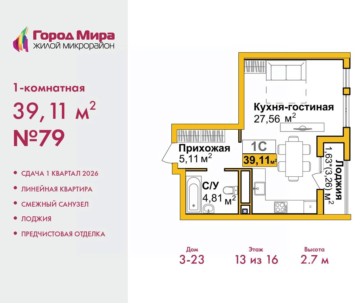 Продается однокомнатная квартира с предчистовой отделкой в ЖМ ''Город Мира'' на 13 этаже. Общая площадь: 39.11 кв.м., жилая: 22.56 кв.м., площадь кухни: 5 кв.м. Все окна выходят на одну сторону. В квартире одна лоджия, один совмещенный санузел. Высота потолков 2.7 м. Жилой комплекс ''Город Мира'' комфорт и гармония в современном формате. ''Город Мира'' это масштабный жилой комплекс, созданный для тех, кто ценит комфорт, безопасность и гармонию с природой. Здесь продумана каждая деталь от удобной инфраструктуры до эргономичных планировок квартир. В 2024 году микрорайон ''Город Мира'' победил в номинации ''Лучший экологический проект года в сфере строительства'' по версии премии Crimea Urban Awards. Ключевые преимущества комплекса: - удачное расположение зеленый район с благоприятным микроклиматом - продуманное зонирование жилые кварталы, зоны отдыха и коммерческие объекты - комфорт-класс высокое качество строительства и современные инженерные решения Инфраструктура ''Города Мира'': Образование и досуг: - 2 детских сада (по 260 мест каждый) - планируется строительство общеобразовательной школы - детские и спортивные площадки в каждом дворе - беседки для отдыха, зоны для выгула собак Ритейл и сервис: - магазины, аптеки, медицинские центры - фитнес-клубы, салоны красоты - детские развивающие центры Парковки: - гостевые парковки - наземные и подземные паркинги Квартиры с продуманным комфортом: - просторные планировки с кладовыми и колясочными - лоджии с остеклением - автономное отопление (по 23 дому: индивидуальное отопление) - выполнена стяжка пола (по 3, 4, 20, 21, 22 домам: выполненная стяжка пола и штукатурка стен) - Консьерж-сервис для дополнительного удобства Благоустройство территории: - ландшафтный дизайн с зонами отдыха - современные детские площадки - стильные холлы с дизайнерской отделкой - система видеонаблюдения для безопасности ''Город Мира'' это место, где созданы все условия для комфортной жизни. Выбирайте качество и продуманность в каждой детали! Квартира находится в корпусе 3_23. Дом монолитный, одноподъездный, высотой 16 этажей. В подъезде 1 пассажирский и 1 грузовой лифт. Окончание строительства - 1 квартал 2026 года. Оформление сделки по договору долевого участия. #2mem0I