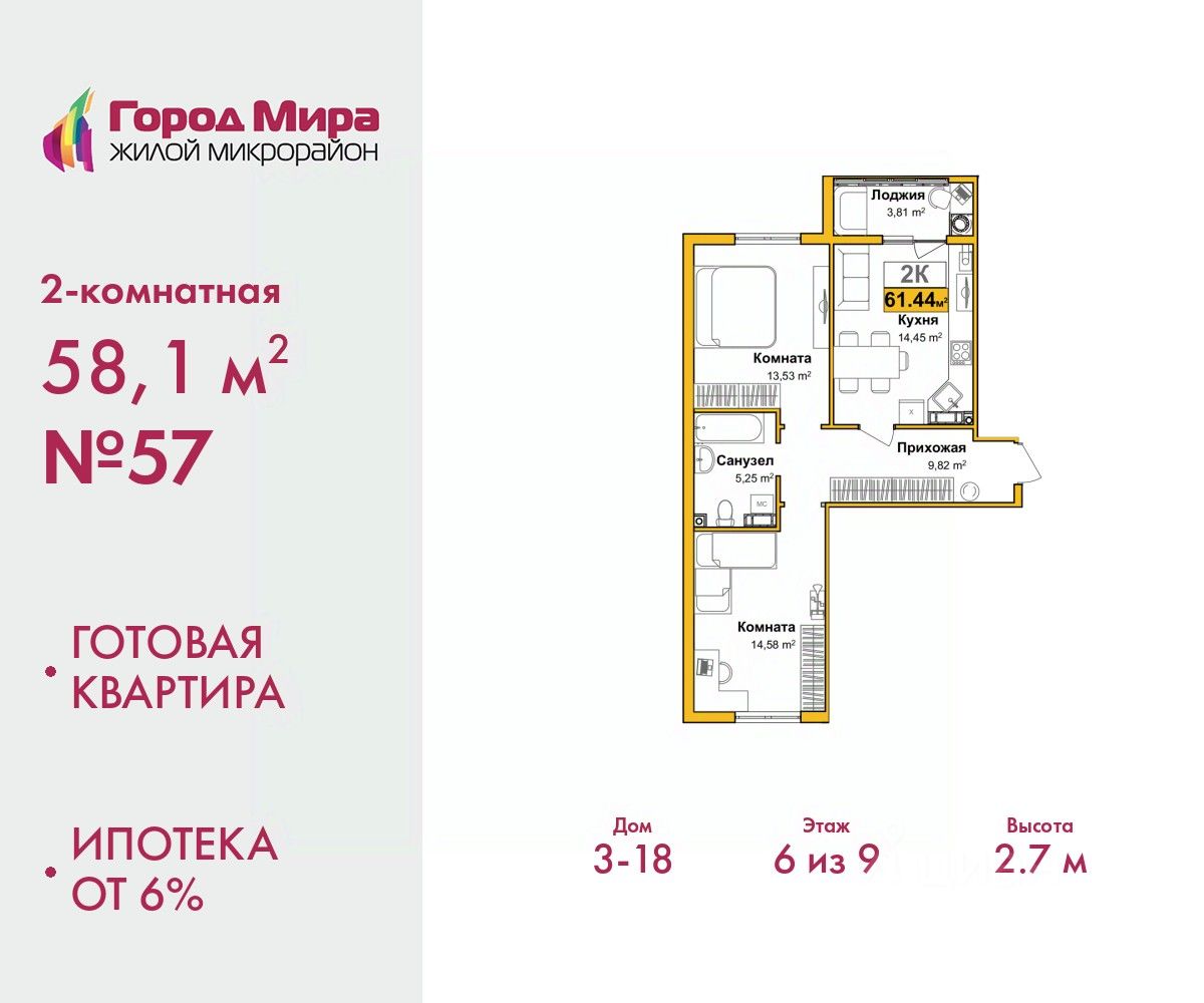 58 м² · Этаж 6 из 9