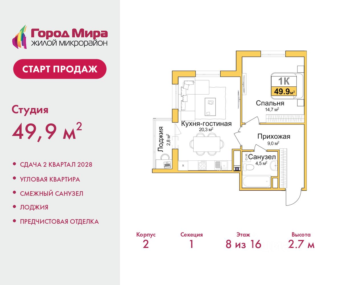 Цена посчитана с учётом скидки 3% при полной оплате или ипотеке. Информация по телефону, мы вам все подробно расскажем. Двухкомнатная квартира с европланировкой и предчистовой отделкой в ЖМ ''Город Мира'' на 8 этаже. Общая площадь: 49.9 кв.м., жилая: 25 кв.м., общая площадь гостиной-столовой с кухонной зоной: 20.3 кв.м. Европейская планировка, зона гостиной комнаты объединена с кухней. Квартира угловая, окна oбecпeчивaют paвнoмepнoe ocвeщeниe в тeчeниe дня. В квартире одна лоджия, один совмещенный санузел. Высота потолков 2.7 м. ''Город Мира'' это масштабный жилой комплекс, созданный для тех, кто ценит комфорт, безопасность и гармонию с природой. Здесь продумана каждая деталь от удобной инфраструктуры до эргономичных планировок квартир. ''Город Мира'' победил в номинации ''Лучший экологический проект года в сфере строительства'' по версии премии Сrimеа Urbаn Аwаrds. Способы приобретения недвижимости в ''Городе Мира'': 1. Ипотека: семейная от 5,5%, военная, IT-ипотека, базовая ипотечная программа и комбо-ипотека. Одобрение заявки проходит сразу в отделе продаж. 2. Материнский капитал на первый взнос. 3. Рассрочка от застройщика - до июня 2028 года! Первоначальный взнос от 30%. 4. Военная ипотека. Участники НИС могут приобрести квартиры по спец.цене. Ключевые преимущества комплекса: удачное расположение зеленый район с благоприятным микроклиматом продуманное зонирование жилые кварталы, зоны отдыха и коммерческие объекты комфорт-класс высокое качество строительства и современные инженерные решения Почему дом повышенной комфортности 2 в ''Городе Мира'' это лучшее решение? Образование и досуг: 2 детских сада (по 260 мест каждый) планируется строительство общеобразовательной школы детские и спортивные площадки в каждом дворе беседки для отдыха, зоны для выгула собак Ритейл и сервис: магазины, аптеки, медицинские центры фитнес-клубы, салоны красоты детские развивающие центры Парковки: гостевые парковки наземные и подземные паркинги Квартиры с продуманным комфортом: просторные планировки с кладовыми и колясочными лоджии с остеклением лапомойки для питомцев на первых этажах домов индивидуальное отопление выполнена стяжка пола и штукатурка стен консьерж-сервис для дополнительного удобства Благоустройство территории: ландшафтный дизайн с зонами отдыха современные детские площадки стильные холлы с дизайнерской отделкой система видеонаблюдения для безопасности ''Город Мира'' это место, где созданы все условия для комфортной жизни. Выбирайте качество и продуманность в каждой детали! Квартира находится во доме повышенной комфортности 2, 4-я очередь. Дом монолитно-каркасный, одноподъездный, высотой 16 этажей. В подъезде 1 пассажирский и 1 грузовой лифт. Окончание строительства - 2 квартал 2028 года. Оформление сделки по договору долевого участия. Квартира находится в корпусе 2. Дом монолитный, одноподъездный, высотой 16 этажей. На этаже 7 квартир. В подъезде 1 пассажирский и 1 грузовой лифт. Окончание строи