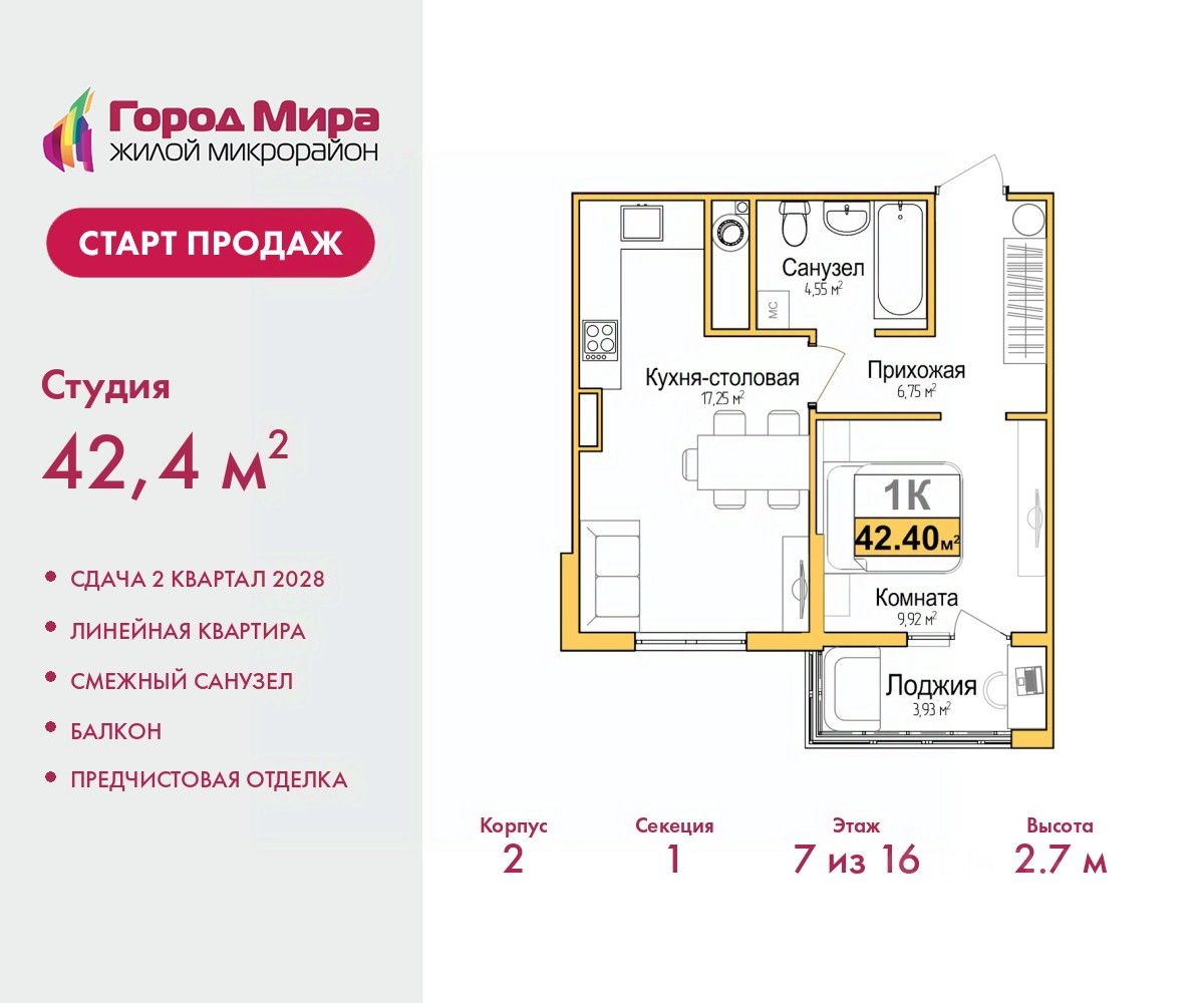 Цена посчитана с учётом скидки 3% при полной оплате или ипотеке. Звоните, наши менеджеры вам все расскажут. 2-комн. квартира с европланировкой и предчистовой отделкой в ЖМ ''Город Мира'' на 7 этаже. Общая площадь: 42.4 кв.м., жилая: 17.17 кв.м., суммарная площадь гостиной-столовой с кухонной зоной: 17.25 кв.м. Европейская планировка, за счет большой площади кухни-гостиной квартира выглядит просторной и очень удобна для жизни. Комнаты изолированные, все окна выходят на одну сторону. В квартире один балкон, один совмещенный санузел. Высота потолков 2.7 м. ''Город Мира'' это масштабный жилой комплекс, созданный для тех, кто ценит комфорт, безопасность и гармонию с природой. Здесь продумана каждая деталь от удобной инфраструктуры до эргономичных планировок квартир. ''Город Мира'' победил в номинации ''Лучший экологический проект года в сфере строительства'' по версии премии Сrimеа Urbаn Аwаrds. Способы приобретения недвижимости в ''Городе Мира'': 1. Ипотека: семейная от 5,5%, военная, IT-ипотека, базовая ипотечная программа и комбо-ипотека. Одобрение заявки проходит сразу в отделе продаж. 2. Материнский капитал на первый взнос. 3. Рассрочка от застройщика - до июня 2028 года! Первоначальный взнос от 30%. 4. Военная ипотека. Участники НИС могут приобрести квартиры по спец.цене. Ключевые преимущества комплекса: удачное расположение зеленый район с благоприятным микроклиматом продуманное зонирование жилые кварталы, зоны отдыха и коммерческие объекты комфорт-класс высокое качество строительства и современные инженерные решения Почему дом повышенной комфортности 2 в ''Городе Мира'' это лучшее решение? Образование и досуг: 2 детских сада (по 260 мест каждый) планируется строительство общеобразовательной школы детские и спортивные площадки в каждом дворе беседки для отдыха, зоны для выгула собак Ритейл и сервис: магазины, аптеки, медицинские центры фитнес-клубы, салоны красоты детские развивающие центры Парковки: гостевые парковки наземные и подземные паркинги Квартиры с продуманным комфортом: просторные планировки с кладовыми и колясочными лоджии с остеклением лапомойки для питомцев на первых этажах домов индивидуальное отопление выполнена стяжка пола и штукатурка стен консьерж-сервис для дополнительного удобства Благоустройство территории: ландшафтный дизайн с зонами отдыха современные детские площадки стильные холлы с дизайнерской отделкой система видеонаблюдения для безопасности ''Город Мира'' это место, где созданы все условия для комфортной жизни. Выбирайте качество и продуманность в каждой детали! Квартира находится во доме повышенной комфортности 2, 4-я очередь. Дом монолитно-каркасный, одноподъездный, высотой 16 этажей. В подъезде 1 пассажирский и 1 грузовой лифт. Окончание строительства - 2 квартал 2028 года. Оформление сделки по договору долевого участия. Квартира находится в корпусе 2. Дом монолитный, одноподъездный, высотой 16 этажей. На этаже 7 квартир. В подъезде 1 пассажирский и 1 грузо