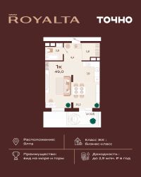 Продаётся 1-комнатная квартира в строящемся доме (Корпус 3), срок сдачи: II-кв. 2027, общей площадью 49 кв.м., на 6 этаже. Жилой комплекс бизнес-класса ''РОЯЛТА'' от застройщика ''ГК ТОЧНО'' в городе Ялта Республики Крым на улице Спендиарова.