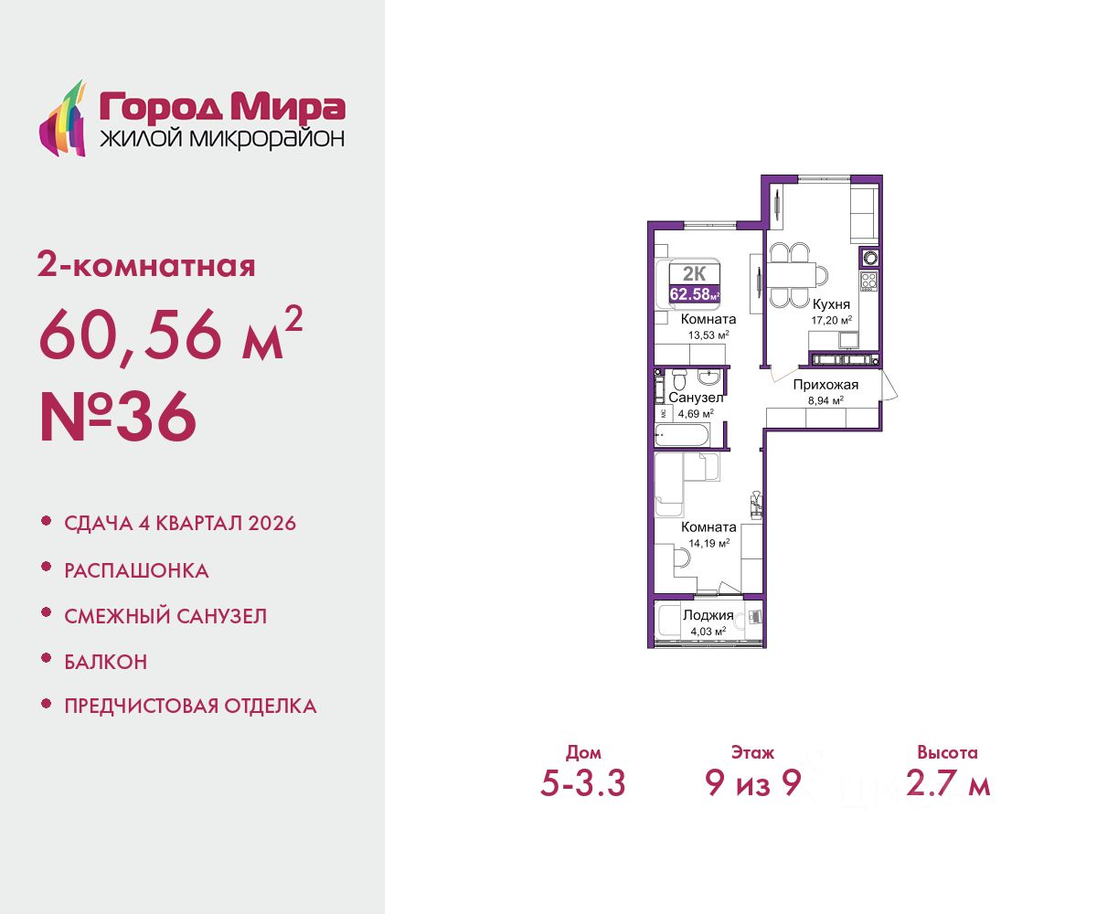 Просторная 2-комн. квартира с предчистовой отделкой в ЖМ ''Город Мира'' на 9 этаже. Общая площадь: 60.56 кв.м., жилая: 27.72 кв.м., площадь просторной кухни-столовой: 17.2 кв.м. Квартира - распашонка, без проходных комнат, окна выходят на paзные стороны дома. В квартире один балкон, один совмещенный санузел. Высота потолков 2.7 м. Квартиры в ЖК ''Город Мира'' ваш комфорт начинается здесь! ''Город Мира'' это масштабный жилой комплекс, созданный для тех, кто ценит комфорт, безопасность и гармонию с природой. Здесь продумана каждая деталь: от удобной инфраструктуры до эргономичных планировок квартир. В 2024 году микрорайон ''Город Мира'' победил в номинации ''Лучший экологический проект года в сфере строительства'' по версии премии Crimea Urban Awards. Почему выбирают наш комплекс: - Зеленый оазис живите среди природы в черте города. - Всё под рукой 2 детских сада, магазины, фитнес, медицина. - Безопасность: закрытая территория с видеонаблюдением. Наши квартиры: - Просторные планировки с кладовыми. - Лоджии с остеклением. - Автономное отопление: платите только за реальное потребление. - Предчистовая отделка, включает стяжку пола, без штукатурки стен. - Консьерж-сервис и подземный паркинг. Инфраструктура комплекса: - Детские и спортивные площадки. - Зоны отдыха с беседками. - Фитнес-клубы и салоны красоты. - Будущая школа на территории, уже функционируют два детских сада. Выгодные условия покупки: - Ипотека от 5,5%, военная ипотека от 5,5%. - Рассрочка. - Материнский капитал на первоначальный взнос. Квартира находится в корпусе 5_3.3. Дом монолитный, одноподъездный, высотой 9 этажей. В подъезде 1 грузовой лифт. Окончание строительства - 4 квартал 2026 года. Оформление сделки по договору долевого участия. #z6gvbd