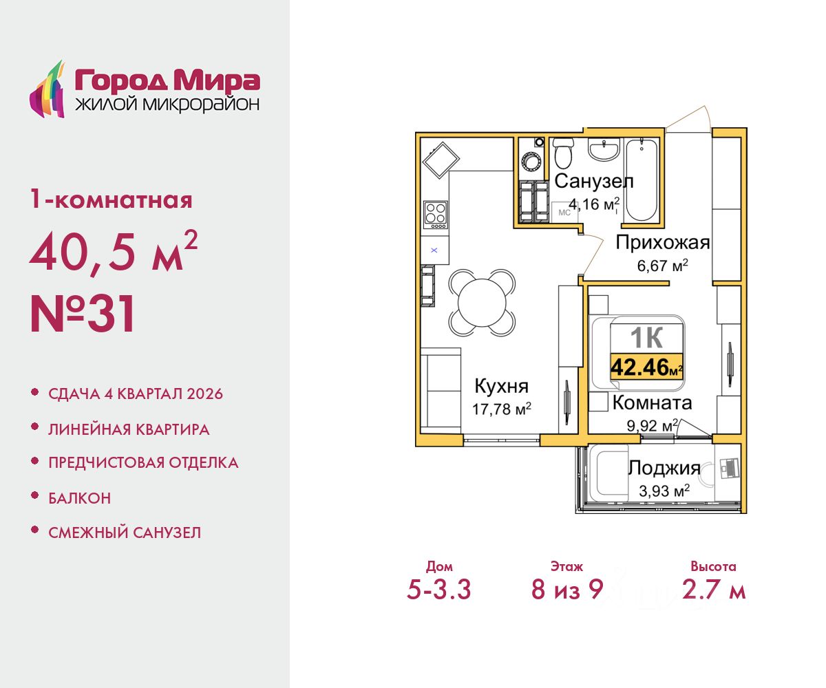 Продается однокомнатная квартира с предчистовой отделкой в ЖМ ''Город Мира'' на 8 этаже. Общая площадь: 40.5 кв.м., жилая: 9.92 кв.м., площадь просторной кухни-столовой: 17.78 кв.м. Все окна выходят на одну сторону. В квартире один балкон, один совмещенный санузел. Высота потолков 2.7 м. Квартиры в ЖК ''Город Мира'' ваш комфорт начинается здесь! ''Город Мира'' это масштабный жилой комплекс, созданный для тех, кто ценит комфорт, безопасность и гармонию с природой. Здесь продумана каждая деталь: от удобной инфраструктуры до эргономичных планировок квартир. В 2024 году микрорайон ''Город Мира'' победил в номинации ''Лучший экологический проект года в сфере строительства'' по версии премии Crimea Urban Awards. Почему выбирают наш комплекс: - Зеленый оазис живите среди природы в черте города. - Всё под рукой 2 детских сада, магазины, фитнес, медицина. - Безопасность: закрытая территория с видеонаблюдением. Наши квартиры: - Просторные планировки с кладовыми. - Лоджии с остеклением. - Автономное отопление: платите только за реальное потребление. - Предчистовая отделка, включает стяжку пола, без штукатурки стен. - Консьерж-сервис и подземный паркинг. Инфраструктура комплекса: - Детские и спортивные площадки. - Зоны отдыха с беседками. - Фитнес-клубы и салоны красоты. - Будущая школа на территории, уже функционируют два детских сада. Выгодные условия покупки: - Ипотека от 5,5%, военная ипотека от 5,5%. - Рассрочка. - Материнский капитал на первоначальный взнос. Квартира находится в корпусе 5_3.3. Дом монолитный, одноподъездный, высотой 9 этажей. В подъезде 1 грузовой лифт. Окончание строительства - 4 квартал 2026 года. Оформление сделки по договору долевого участия. #2MDoFu