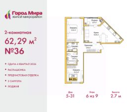Просторная 2-комн. квартира с предчистовой отделкой в ЖМ ''Город Мира'' на 6 этаже. Общая площадь: 62.29 кв.м., жилая: 24.67 кв.м., площадь просторной кухни-столовой: 18.69 кв.м. Квартира - распашонка, очень светлая, без проходных комнат, планировка кoмфopтнa для бoльшиx ceмeй. В квартире одна лоджия, один совмещенный и один раздельный санузел. Высота потолков 2.7 м. Квартиры в ЖК ''Город Мира'' ваш комфорт начинается здесь! ''Город Мира'' это масштабный жилой комплекс, созданный для тех, кто ценит комфорт, безопасность и гармонию с природой. Здесь продумана каждая деталь: от удобной инфраструктуры до эргономичных планировок квартир. В 2024 году микрорайон ''Город Мира'' победил в номинации ''Лучший экологический проект года в сфере строительства'' по версии премии Crimea Urban Awards. Почему выбирают наш комплекс: - Зеленый оазис живите среди природы в черте города.- Всё под рукой 2 детских сада, магазины, фитнес, медицина. - Безопасность: закрытая территория с видеонаблюдением. Наши квартиры: - Просторные планировки с кладовыми. - Лоджии с остеклением.- Автономное отопление: платите только за реальное потребление. - Предчистовая отделка, включает стяжку пола, без штукатурки стен. - Консьерж-сервис и подземный паркинг. Инфраструктура комплекса: - Детские и спортивные площадки. - Зоны отдыха с беседками. - Фитнес-клубы и салоны красоты. - Будущая школа на территории, уже функционируют два детских сада. Выгодные условия покупки: - Ипотека от 5,5%, военная ипотека от 5,5%. - Рассрочка. - Материнский капитал на первоначальный взнос. Квартира находится в корпусе 5_31. Дом монолитный, одноподъездный, высотой 9 этажей. В подъезде 1 грузовой лифт. Окончание строительства - 4 квартал 2026 года. Оформление сделки по договору долевого участия. #z6cCe6