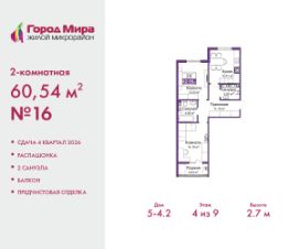 Двухкомнатная квартира с предчистовой отделкой в ЖМ ''Город Мира'' на 4 этаже. Общая площадь: 60.54 кв.м., жилая: 27.72 кв.м., площадь просторной кухни-столовой: 12.01 кв.м. Квартира - распашонка, без проходных комнат, окна выходят на paзные стороны дома. В квартире один балкон, один совмещенный и один раздельный санузел. Высота потолков 2.7 м. Квартиры в ЖК ''Город Мира'' ваш комфорт начинается здесь! ''Город Мира'' это масштабный жилой комплекс, созданный для тех, кто ценит комфорт, безопасность и гармонию с природой. Здесь продумана каждая деталь: от удобной инфраструктуры до эргономичных планировок квартир. В 2024 году микрорайон ''Город Мира'' победил в номинации ''Лучший экологический проект года в сфере строительства'' по версии премии Crimea Urban Awards. Почему выбирают наш комплекс: - Зеленый оазис живите среди природы в черте города.- Всё под рукой 2 детских сада, магазины, фитнес, медицина. - Безопасность: закрытая территория с видеонаблюдением. Наши квартиры: - Просторные планировки с кладовыми. - Лоджии с остеклением.- Автономное отопление: платите только за реальное потребление. - Предчистовая отделка, включает стяжку пола, без штукатурки стен. - Консьерж-сервис и подземный паркинг. Инфраструктура комплекса: - Детские и спортивные площадки. - Зоны отдыха с беседками. - Фитнес-клубы и салоны красоты. - Будущая школа на территории, уже функционируют два детских сада. Выгодные условия покупки: - Ипотека от 5,5%, военная ипотека от 5,5%. - Рассрочка. - Материнский капитал на первоначальный взнос. Квартира находится в корпусе 5_4.2. Дом монолитный, одноподъездный, высотой 9 этажей. В подъезде 1 грузовой лифт. Окончание строительства - 4 квартал 2026 года. Оформление сделки по договору долевого участия. #z5s9Az