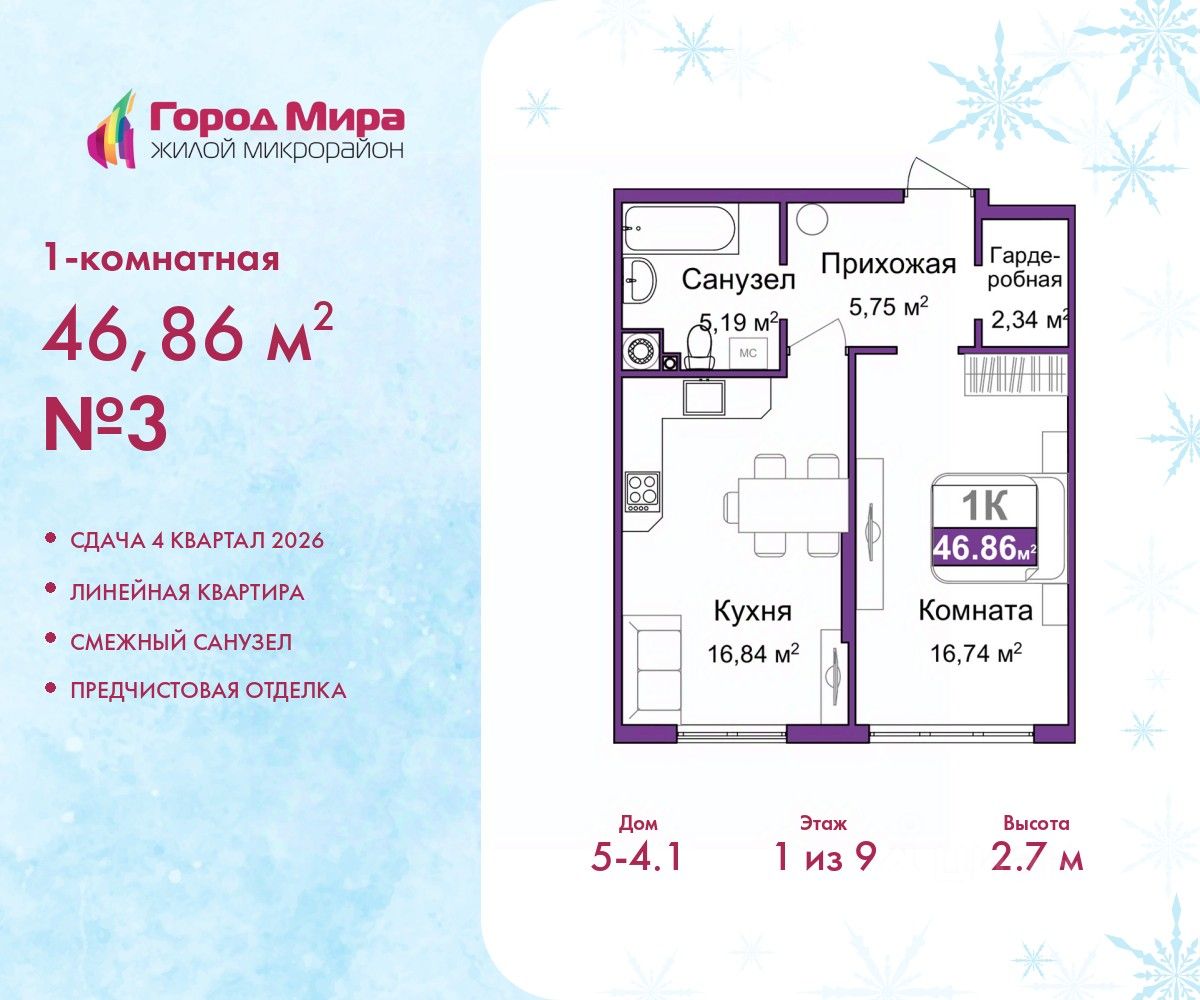 Однокомнатная квартира с предчистовой отделкой в ЖМ ''Город Мира'' на 1 этаже. Общая площадь: 46.86 кв.м., жилая: 16.74 кв.м., площадь просторной кухни-столовой: 16.84 кв.м. Все окна выходят на одну сторону. В квартире один совмещенный санузел. Высота потолков 2.7 м. Квартиры в ЖК ''Город Мира'' ваш комфорт начинается здесь! ''Город Мира'' это масштабный жилой комплекс, созданный для тех, кто ценит комфорт, безопасность и гармонию с природой. Здесь продумана каждая деталь: от удобной инфраструктуры до эргономичных планировок квартир. В 2024 году микрорайон ''Город Мира'' победил в номинации ''Лучший экологический проект года в сфере строительства'' по версии премии Crimea Urban Awards. Почему выбирают наш комплекс: - Зеленый оазис живите среди природы в черте города. - Всё под рукой 2 детских сада, магазины, фитнес, медицина. - Безопасность: закрытая территория с видеонаблюдением. Наши квартиры: - Просторные планировки с кладовыми. - Лоджии с остеклением. - Автономное отопление: платите только за реальное потребление. - Предчистовая отделка, включает стяжку пола, без штукатурки стен. - Консьерж-сервис и подземный паркинг. Инфраструктура комплекса: - Детские и спортивные площадки. - Зоны отдыха с беседками. - Фитнес-клубы и салоны красоты. - Будущая школа на территории, уже функционируют два детских сада. Выгодные условия покупки: - Ипотека от 5,5%, военная ипотека от 5,5%. - Рассрочка. - Материнский капитал на первоначальный взнос. Квартира находится в корпусе 5_4.1. Дом монолитный, одноподъездный, высотой 9 этажей. В подъезде 1 грузовой лифт. Окончание строительства - 4 квартал 2026 года. Оформление сделки по договору долевого участия. #z6ai0C