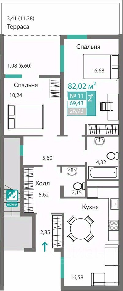 58 м² · Этаж 15 из 16