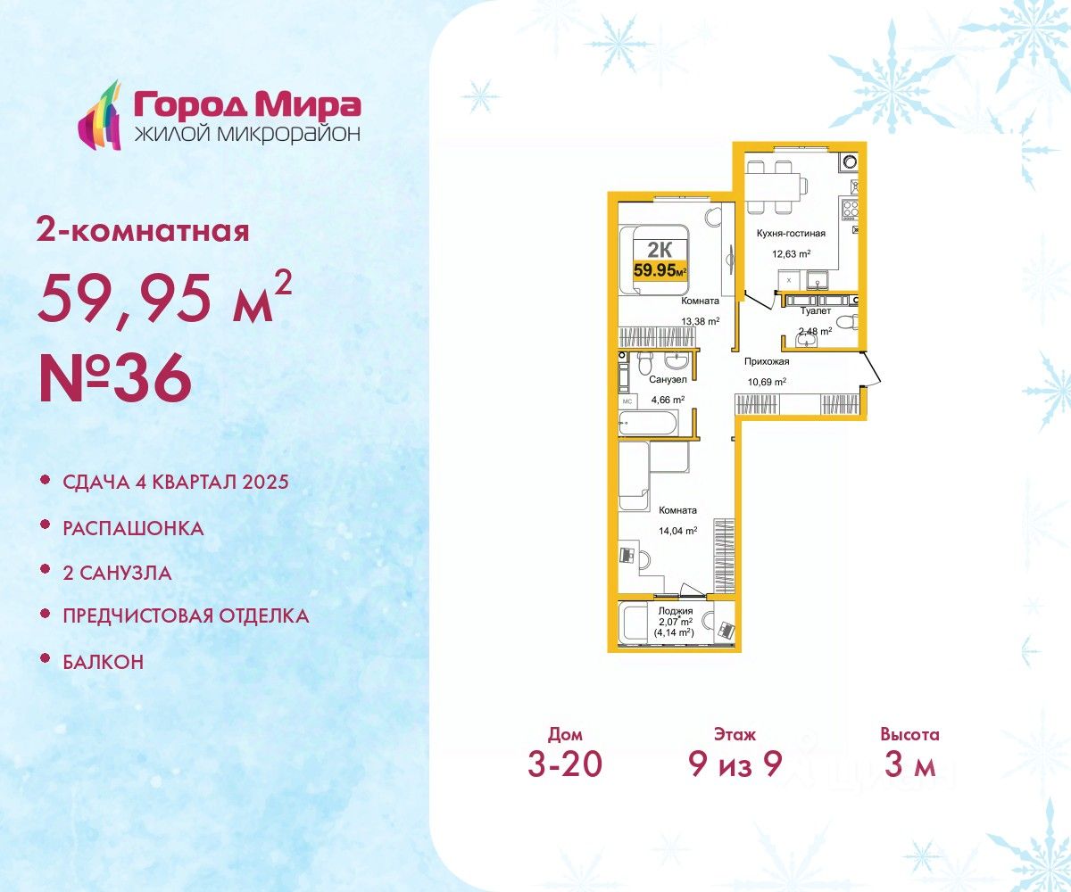 Торопитесь забронировать по этой цене! Предложение ограничено! Стоимость квартиры указана со скидкой, ваша экономия составит 934,200 RUB. По всем вопросам обращайтесь в офис продаж, наши менеджеры вам все расскажут! Двухкомнатная квартира с предчистовой отделкой в ЖМ ''Город Мира'' на 9 этаже. Общая площадь: 59.95 кв.м., жилая: 27.42 кв.м., площадь просторной кухни-столовой: 12.63 кв.м. Квартира - распашонка, без проходных комнат, окна выходят на paзные стороны дома. В квартире один балкон, один совмещенный и один раздельный санузел. Высота потолков 3 м. Жилой комплекс ''Город Мира'' комфорт и гармония в современном формате. ''Город Мира'' это масштабный жилой комплекс, созданный для тех, кто ценит комфорт, безопасность и гармонию с природой. Здесь продумана каждая деталь от удобной инфраструктуры до эргономичных планировок квартир. В 2024 году микрорайон ''Город Мира'' победил в номинации ''Лучший экологический проект года в сфере строительства'' по версии премии Crimea Urban Awards. Ключевые преимущества комплекса: - удачное расположение зеленый район с благоприятным микроклиматом - продуманное зонирование жилые кварталы, зоны отдыха и коммерческие объекты - комфорт-класс высокое качество строительства и современные инженерные решения Инфраструктура ''Города Мира'': Образование и досуг: - 2 детских сада (по 260 мест каждый) - планируется строительство общеобразовательной школы - детские и спортивные площадки в каждом дворе - беседки для отдыха, зоны для выгула собак Ритейл и сервис: - магазины, аптеки, медицинские центры - фитнес-клубы, салоны красоты - детские развивающие центры Парковки: - гостевые парковки - наземные и подземные паркинги Квартиры с продуманным комфортом: - просторные планировки с кладовыми и колясочными - автономное отопление (по 23 дому: индивидуальное отопление) - выполнена стяжка пола (по 3, 4, 20, 21 ,22 домам: выполненная стяжка пола и штукатурка стен) - Консьерж-сервис для дополнительного удобства Благоустройство территории: - ландшафтный дизайн с зонами отдыха - современные детские площадки - стильные холлы с дизайнерской отделкой - система видеонаблюдения для безопасности ''Город Мира'' это место, где созданы все условия для комфортной жизни. Выбирайте качество и продуманность в каждой детали! Квартира находится в корпусе 3_20. Дом монолитный, одноподъездный, высотой 9 этажей. В подъезде 1 грузовой лифт. Окончание строительства - 4 квартал 2025 года. Оформление сделки по договору долевого участия. #25DDEv