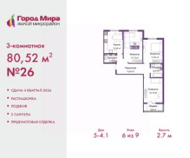 Трехкомнатная квартира с предчистовой отделкой в ЖМ ''Город Мира'' на 6 этаже. Общая площадь: 80.52 кв.м., жилая: 45.88 кв.м., площадь просторной кухни-столовой: 12.04 кв.м. Квартира - распашонка, без проходных комнат, окна выходят на paзные стороны дома. В квартире одна лоджия, один совмещенный и один раздельный санузел. Высота потолков 2.7 м. Квартиры в ЖК ''Город Мира'' ваш комфорт начинается здесь! ''Город Мира'' это масштабный жилой комплекс, созданный для тех, кто ценит комфорт, безопасность и гармонию с природой. Здесь продумана каждая деталь: от удобной инфраструктуры до эргономичных планировок квартир. В 2024 году микрорайон ''Город Мира'' победил в номинации ''Лучший экологический проект года в сфере строительства'' по версии премии Crimea Urban Awards. Почему выбирают наш комплекс: - Зеленый оазис живите среди природы в черте города.- Всё под рукой 2 детских сада, магазины, фитнес, медицина. - Безопасность: закрытая территория с видеонаблюдением. Наши квартиры: - Просторные планировки с кладовыми. - Лоджии с остеклением.- Автономное отопление: платите только за реальное потребление. - Предчистовая отделка, включает стяжку пола, без штукатурки стен.- Консьерж-сервис и подземный паркинг. Инфраструктура комплекса: - Детские и спортивные площадки. - Зоны отдыха с беседками. - Фитнес-клубы и салоны красоты. - Будущая школа на территории, уже функционируют два детских сада. Выгодные условия покупки: - Ипотека от 5,5%, военная ипотека от 5,5%. - Рассрочка. - Материнский капитал на первоначальный взнос. Квартира находится в корпусе 5_4.1. Дом монолитный, одноподъездный, высотой 9 этажей. В подъезде 1 грузовой лифт. Окончание строительства - 4 квартал 2026 года. Оформление сделки по договору долевого участия. #Z5ESU3