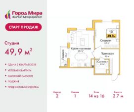 Цена посчитана с учётом скидки 3% при полной оплате или ипотеке. Звоните, наши менеджеры вам все расскажут. Продается 2-комн. квартира с европланировкой и предчистовой отделкой в ЖМ ''Город Мира'' на 14 этаже. Общая площадь: 49.9 кв.м., жилая: 25 кв.м., суммарная площадь гостиной-столовой с кухонной зоной: 20.3 кв.м. Европланировка, в просторной кухне-гостиной удобно как готовить, так и отдыхать. Квартира угловая, очень светлая, естественная вентиляция при открытии окон. В квартире одна лоджия, один совмещенный санузел. Высота потолков 2.7 м. ''Город Мира'' это масштабный жилой комплекс, созданный для тех, кто ценит комфорт, безопасность и гармонию с природой. Здесь продумана каждая деталь от удобной инфраструктуры до эргономичных планировок квартир. ''Город Мира'' победил в номинации ''Лучший экологический проект года в сфере строительства'' по версии премии Сrimеа Urbаn Аwаrds. Способы приобретения недвижимости в ''Городе Мира'':1. Ипотека: семейная от 5,5%, военная, IT-ипотека, базовая ипотечная программа и комбо-ипотека. Одобрение заявки проходит сразу в отделе продаж. 2. Материнский капитал на первый взнос.3. Рассрочка от застройщика - до июня 2028 года! Первоначальный взнос от 30%.4. Военная ипотека. Участники НИС могут приобрести квартиры по спец.цене. Ключевые преимущества комплекса:удачное расположение зеленый район с благоприятным микроклиматомпродуманное зонирование жилые кварталы, зоны отдыха и коммерческие объектыкомфорт-класс высокое качество строительства и современные инженерные решения Почему дом повышенной комфортности 2 в ''Городе Мира'' это лучшее решение? Образование и досуг: 2 детских сада (по 260 мест каждый) планируется строительство общеобразовательной школы детские и спортивные площадки в каждом дворе беседки для отдыха, зоны для выгула собак Ритейл и сервис: магазины, аптеки, медицинские центры фитнес-клубы, салоны красоты детские развивающие центры Парковки: гостевые парковки наземные и подземные паркинги Квартиры с продуманным комфортом: просторные планировки с кладовыми и колясочными лоджии с остеклением лапомойки для питомцев на первых этажах домов индивидуальное отопление выполнена стяжка пола и штукатурка стен консьерж-сервис для дополнительного удобства Благоустройство территории: ландшафтный дизайн с зонами отдыха современные детские площадки стильные холлы с дизайнерской отделкой система видеонаблюдения для безопасности ''Город Мира'' это место, где созданы все условия для комфортной жизни. Выбирайте качество и продуманность в каждой детали! Квартира находится во доме повышенной комфортности 2, 4-я очередь. Дом монолитно-каркасный, одноподъездный, высотой 16 этажей. В подъезде 1 пассажирский и 1 грузовой лифт. Окончание строительства - 2 квартал 2028 года. Оформление сделки по договору долевого участия. Квартира находится в корпусе 2. Дом монолитный, одноподъездный, высотой 16 этажей. На этаже 7 квартир. В подъезде 1 пассажирский и 1 грузовой лифт. О