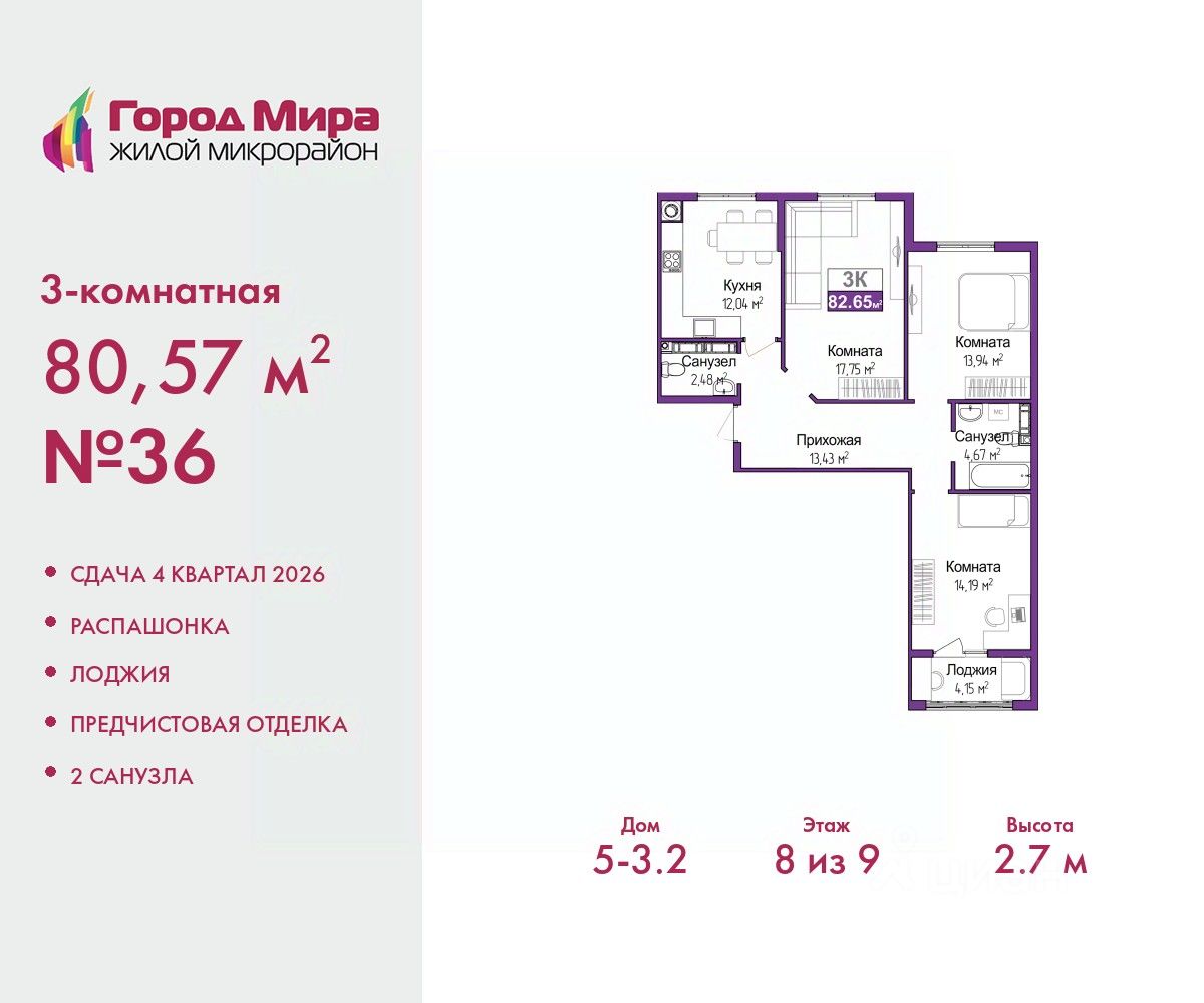 Продается 3-комн. квартира с предчистовой отделкой в ЖМ ''Город Мира'' на 8 этаже. Общая площадь: 79.93 кв.м., жилая: 42.86 кв.м., площадь просторной кухни-столовой: 16.07 кв.м. Квартира - распашонка, без проходных комнат, окна выходят на paзные стороны дома. В квартире одна лоджия, один совмещенный и один раздельный санузел. Высота потолков 2.7 м. Жилой комплекс ''Город Мира'' комфорт и гармония в современном формате. ''Город Мира'' это масштабный жилой комплекс, созданный для тех, кто ценит комфорт, безопасность и гармонию с природой. Здесь продумана каждая деталь от удобной инфраструктуры до эргономичных планировок квартир. В 2024 году микрорайон ''Город Мира'' победил в номинации ''Лучший экологический проект года в сфере строительства'' по версии премии Crimea Urban Awards. Ключевые преимущества комплекса: - удачное расположение зеленый район с благоприятным микроклиматом - продуманное зонирование жилые кварталы, зоны отдыха и коммерческие объекты - комфорт-класс высокое качество строительства и современные инженерные решения Инфраструктура ''Города Мира'': Образование и досуг: - 2 детских сада (по 260 мест каждый) - планируется строительство общеобразовательной школы - детские и спортивные площадки в каждом дворе - беседки для отдыха, зоны для выгула собак Ритейл и сервис: - магазины, аптеки, медицинские центры - фитнес-клубы, салоны красоты - детские развивающие центры Парковки: - гостевые парковки - наземные и подземные паркинги Квартиры с продуманным комфортом: - просторные планировки с кладовыми и колясочными - лоджии с остеклением - автономное отопление (по 23 дому: индивидуальное отопление) - выполнена стяжка пола (по 3, 4, 20, 21, 22 домам: выполненная стяжка пола и штукатурка стен) - Консьерж-сервис для дополнительного удобства Благоустройство территории: - ландшафтный дизайн с зонами отдыха - современные детские площадки - стильные холлы с дизайнерской отделкой - система видеонаблюдения для безопасности ''Город Мира'' это место, где созданы все условия для комфортной жизни. Выбирайте качество и продуманность в каждой детали! Квартира находится в корпусе 3_21. Дом монолитный, одноподъездный, высотой 9 этажей. В подъезде 1 грузовой лифт. Окончание строительства - 1 квартал 2026 года. Оформление сделки по договору долевого участия. #zmSf6C