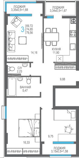 Продаётся 3-комнатная квартира в строящемся доме (Корпус 3), срок сдачи: I-кв. 2026, общей площадью 79.03 кв.м., на 2 этаже. Жилой комплекс ''На Фонтанке'' в городе Алушта на улице Багликова.
