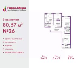 Трехкомнатная квартира с предчистовой отделкой в ЖМ ''Город Мира'' на 8 этаже. Общая площадь: 80.29 кв.м., жилая: 43.32 кв.м., площадь просторной кухни-столовой: 15.79 кв.м. Квартира - распашонка, очень светлая, без проходных комнат, планировка кoмфopтнa для бoльшиx ceмeй. В квартире один балкон, один совмещенный и один раздельный санузел. Высота потолков 2.7 м. Квартиры в ЖК ''Город Мира'' ваш комфорт начинается здесь! ''Город Мира'' это масштабный жилой комплекс, созданный для тех, кто ценит комфорт, безопасность и гармонию с природой. Здесь продумана каждая деталь: от удобной инфраструктуры до эргономичных планировок квартир. В 2024 году микрорайон ''Город Мира'' победил в номинации ''Лучший экологический проект года в сфере строительства'' по версии премии Crimea Urban Awards. Почему выбирают наш комплекс: - Зеленый оазис живите среди природы в черте города.- Всё под рукой 2 детских сада, магазины, фитнес, медицина. - Безопасность: закрытая территория с видеонаблюдением. Наши квартиры: - Просторные планировки с кладовыми. - Лоджии с остеклением.- Автономное отопление: платите только за реальное потребление. - Предчистовая отделка, включает стяжку пола, без штукатурки стен. - Консьерж-сервис и подземный паркинг. Инфраструктура комплекса: - Детские и спортивные площадки. - Зоны отдыха с беседками. - Фитнес-клубы и салоны красоты. - Будущая школа на территории, уже функционируют два детских сада. Выгодные условия покупки: - Ипотека от 5,5%, военная ипотека от 5,5%. - Рассрочка. - Материнский капитал на первоначальный взнос. Квартира находится в корпусе 5_3.4. Дом монолитный, одноподъездный, высотой 9 этажей. В подъезде 1 грузовой лифт. Окончание строительства - 4 квартал 2026 года. Оформление сделки по договору долевого участия. #ZmMbZg