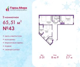 Просторная 2-комн. квартира с предчистовой отделкой в ЖМ ''Город Мира'' на 8 этаже. Общая площадь: 65.51 кв.м., жилая: 28.49 кв.м., площадь просторной кухни-столовой: 14.63 кв.м. Квартира - распашонка, без проходных комнат, окна выходят на paзные стороны дома. В квартире одна лоджия, один совмещенный санузел. Высота потолков 2.7 м. Квартиры в ЖК ''Город Мира'' ваш комфорт начинается здесь! ''Город Мира'' это масштабный жилой комплекс, созданный для тех, кто ценит комфорт, безопасность и гармонию с природой. Здесь продумана каждая деталь: от удобной инфраструктуры до эргономичных планировок квартир. В 2024 году микрорайон ''Город Мира'' победил в номинации ''Лучший экологический проект года в сфере строительства'' по версии премии Crimea Urban Awards. Почему выбирают наш комплекс: - Зеленый оазис живите среди природы в черте города.- Всё под рукой 2 детских сада, магазины, фитнес, медицина. - Безопасность: закрытая территория с видеонаблюдением. Наши квартиры: - Просторные планировки с кладовыми. - Автономное отопление: платите только за реальное потребление. - Предчистовая отделка, включает стяжку пола, без штукатурки стен. - Консьерж-сервис и подземный паркинг. Инфраструктура комплекса: - Детские и спортивные площадки. - Зоны отдыха с беседками. - Фитнес-клубы и салоны красоты. - Будущая школа на территории, уже функционируют два детских сада. Выгодные условия покупки: - Ипотека от 5,5%, военная ипотека от 5,5%. - Рассрочка. - Материнский капитал на первоначальный взнос. Квартира находится в корпусе 5_31. Дом монолитный, одноподъездный, высотой 9 этажей. В подъезде 1 грузовой лифт. Окончание строительства - 4 квартал 2026 года. Оформление сделки по договору долевого участия. #2sS99O
