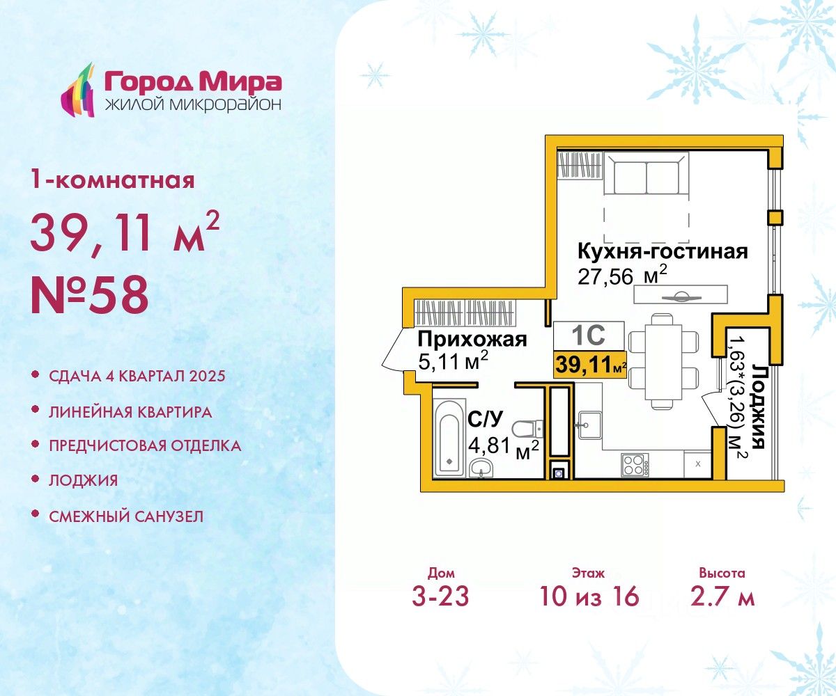 1-комн. квартира с предчистовой отделкой в ЖМ ''Город Мира'' на 10 этаже. Общая площадь: 39.11 кв.м., жилая: 22.56 кв.м., площадь кухни: 5 кв.м. Все окна выходят на одну сторону. В квартире одна лоджия, один совмещенный санузел. Высота потолков 2.7 м. ''Город Мира'' это масштабный жилой комплекс, созданный для тех, кто ценит комфорт, безопасность и гармонию с природой. Здесь продумана каждая деталь от удобной инфраструктуры до эргономичных планировок квартир. Главные преимущества: Удачное расположение зеленый район с благоприятным микроклиматом Продуманное зонирование жилые кварталы, зоны отдыха и коммерческие объекты Комфорт-класс высокое качество строительства и современные инженерные решения Инфраструктура Города Мира: Образование и досуг: 2 детских сада (по 260 мест каждый) Планируется строительство общеобразовательной школы Детские и спортивные площадки в каждом дворе Беседки для отдыха, зоны для выгула собак Торговля и сервис: Магазины, аптеки, медицинские центры Фитнес-клубы, салоны красоты Детские развивающие центры Парковки: Гостевые парковки Наземные и подземные паркинги Благоустройство территории: Ландшафтный дизайн с зонами отдыха Современные детские площадки Стильные холлы с дизайнерской отделкой Система видеонаблюдения для безопасности. Почему именно 23-й дом? Комфорт и планировки: • Просторные квартиры с двумя санузлами и гардеробными • Увеличенная площадь остекления — максимум света и воздуха • Индивидуальное отопление — комфорт в любое время года Эстетика и стиль: • Дизайнерские входные группы — стиль начинается с порога • Архитектурная подсветка фасада — дом, которым хочется гордиться • Панорамные виды на город и сосновый бор рядом Инфраструктура и удобство: • Консьерж-сервис — дополнительный уровень сервиса и безопасности • Колясочные • Выполнена стяжка пола и штукатурка стен • Центральная локация внутри микрорайона — тишина и доступность Жизнь внутри дома: • Двухэтажный стилобат с коммерцией: магазины, кафе, офисы, студии и даже школа танцев • Современный двор: детский игровой комплекс, зоны отдыха для взрослых, зарядка для электромобилей, зона wi-fi на улице Возможно приобретение в ипотеку по выгодным условиям: • ставка — от 6% годовых • первоначальный взнос — от 20% • срок — до 30 лет • можно использовать материнский капитал даже на первый взнос. Также доступны военная и IT-ипотека Рассрочка от застройщика: • первый взнос от 30%, • равномерные платежи до окончания строительства. Квартира находится в корпусе 3_23. Дом монолитный, одноподъездный, высотой 16 этажей. В подъезде 1 пассажирский и 1 грузовой лифт. Окончание строительства - 4 квартал 2025 года. Оформление сделки по договору долевого участия. #25S982