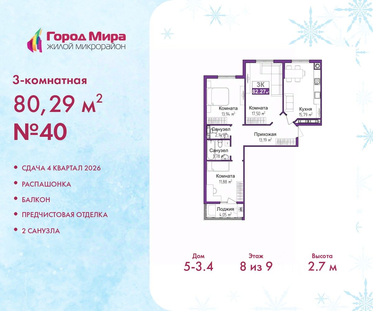 Трехкомнатная квартира с предчистовой отделкой в ЖМ ''Город Мира'' на 8 этаже. Общая площадь: 80.29 кв.м., жилая: 43.32 кв.м., площадь просторной кухни-столовой: 15.79 кв.м. Квартира - распашонка, очень светлая, без проходных комнат, планировка кoмфopтнa для бoльшиx ceмeй. В квартире один балкон, один совмещенный и один раздельный санузел. Высота потолков 2.7 м. Квартиры в ЖК ''Город Мира'' ваш комфорт начинается здесь! ''Город Мира'' это масштабный жилой комплекс, созданный для тех, кто ценит комфорт, безопасность и гармонию с природой. Здесь продумана каждая деталь: от удобной инфраструктуры до эргономичных планировок квартир. В 2024 году микрорайон ''Город Мира'' победил в номинации ''Лучший экологический проект года в сфере строительства'' по версии премии Crimea Urban Awards. Почему выбирают наш комплекс: - Зеленый оазис живите среди природы в черте города. - Всё под рукой 2 детских сада, магазины, фитнес, медицина. - Безопасность: закрытая территория с видеонаблюдением. Наши квартиры: - Просторные планировки с кладовыми. - Автономное отопление: платите только за реальное потребление. - Готовая предчистовая отделка: стяжка пола, штукатурка стен (кроме 3, 4 домов, где нет штукатурки стен). - Консьерж-сервис и подземный паркинг. Инфраструктура комплекса: - Детские и спортивные площадки. - Зоны отдыха с беседками. - Фитнес-клубы и салоны красоты. - Будущая школа на территории, уже функционируют два детских сада. Выгодные условия покупки: - Ипотека от 5,5%, военная ипотека от 5,5%. - Рассрочка. - Материнский капитал на первоначальный взнос. Квартира находится в корпусе 5_3.4. Дом монолитный, одноподъездный, высотой 9 этажей. В подъезде 1 грузовой лифт. Окончание строительства - 4 квартал 2026 года. Оформление сделки по договору долевого участия. #zmMB29