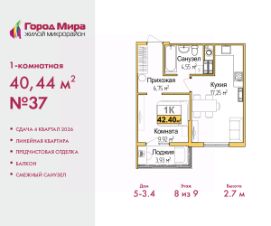 Продается 1-комн. квартира с предчистовой отделкой в ЖМ ''Город Мира'' на 7 этаже. Общая площадь: 40.44 кв.м., жилая: 9.92 кв.м., площадь просторной кухни-столовой: 17.25 кв.м. Все окна выходят на одну сторону. В квартире один балкон, один совмещенный санузел. Высота потолков 2.7 м. Квартиры в ЖК ''Город Мира'' ваш комфорт начинается здесь! ''Город Мира'' это масштабный жилой комплекс, созданный для тех, кто ценит комфорт, безопасность и гармонию с природой. Здесь продумана каждая деталь: от удобной инфраструктуры до эргономичных планировок квартир. В 2024 году микрорайон ''Город Мира'' победил в номинации ''Лучший экологический проект года в сфере строительства'' по версии премии Crimea Urban Awards. Почему выбирают наш комплекс: - Зеленый оазис живите среди природы в черте города.- Всё под рукой 2 детских сада, магазины, фитнес, медицина. - Безопасность: закрытая территория с видеонаблюдением. Наши квартиры: - Просторные планировки с кладовыми. - Лоджии с остеклением.- Автономное отопление: платите только за реальное потребление. - Предчистовая отделка, включает стяжку пола, без штукатурки стен.- Консьерж-сервис и подземный паркинг. Инфраструктура комплекса: - Детские и спортивные площадки. - Зоны отдыха с беседками. - Фитнес-клубы и салоны красоты. - Будущая школа на территории, уже функционируют два детских сада. Выгодные условия покупки: - Ипотека от 5,5%, военная ипотека от 5,5%. - Рассрочка. - Материнский капитал на первоначальный взнос. Квартира находится в корпусе 5_4.1. Дом монолитный, одноподъездный, высотой 9 этажей. В подъезде 1 грузовой лифт. Окончание строительства - 4 квартал 2026 года. Оформление сделки по договору долевого участия. #ZmBDco