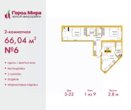 Продается 2-комн. квартира с предчистовой отделкой в ЖМ ''Город Мира'' на 1 этаже. Общая площадь: 66.04 кв.м., жилая: 30.01 кв.м., площадь просторной кухни-столовой: 18.75 кв.м. Квартира - распашонка, без проходных комнат, окна выходят на paзные стороны дома. В квартире одна лоджия, один совмещенный и один раздельный санузел. Высота потолков 2.8 м. Жилой комплекс ''Город Мира'' комфорт и гармония в современном формате. ''Город Мира'' это масштабный жилой комплекс, созданный для тех, кто ценит комфорт, безопасность и гармонию с природой. Здесь продумана каждая деталь от удобной инфраструктуры до эргономичных планировок квартир. В 2024 году микрорайон ''Город Мира'' победил в номинации ''Лучший экологический проект года в сфере строительства'' по версии премии Crimea Urban Awards. Ключевые преимущества комплекса:- удачное расположение зеленый район с благоприятным микроклиматом- продуманное зонирование жилые кварталы, зоны отдыха и коммерческие объекты- комфорт-класс высокое качество строительства и современные инженерные решения Инфраструктура ''Города Мира'': Образование и досуг:- 2 детских сада (по 260 мест каждый)- планируется строительство общеобразовательной школы- детские и спортивные площадки в каждом дворе- беседки для отдыха, зоны для выгула собак Ритейл и сервис:- магазины, аптеки, медицинские центры- фитнес-клубы, салоны красоты- детские развивающие центры Парковки:- гостевые парковки- наземные и подземные паркинги Квартиры с продуманным комфортом:- просторные планировки с кладовыми и колясочными- лоджии с остеклением- автономное отопление (по 23 дому: индивидуальное отопление)- выполнена стяжка пола (по 3, 4, 20, 21, 22 домам: выполненная стяжка пола и штукатурка стен) - Консьерж-сервис для дополнительного удобства Благоустройство территории:- ландшафтный дизайн с зонами отдыха- современные детские площадки- стильные холлы с дизайнерской отделкой- система видеонаблюдения для безопасности ''Город Мира'' это место, где созданы все условия для комфортной жизни. Выбирайте качество и продуманность в каждой детали! Квартира находится в корпусе 3_22. Дом монолитный, одноподъездный, высотой 9 этажей. В подъезде 1 грузовой лифт. Окончание строительства - 1 квартал 2026 года. Оформление сделки по договору долевого участия. #Z5aT5d