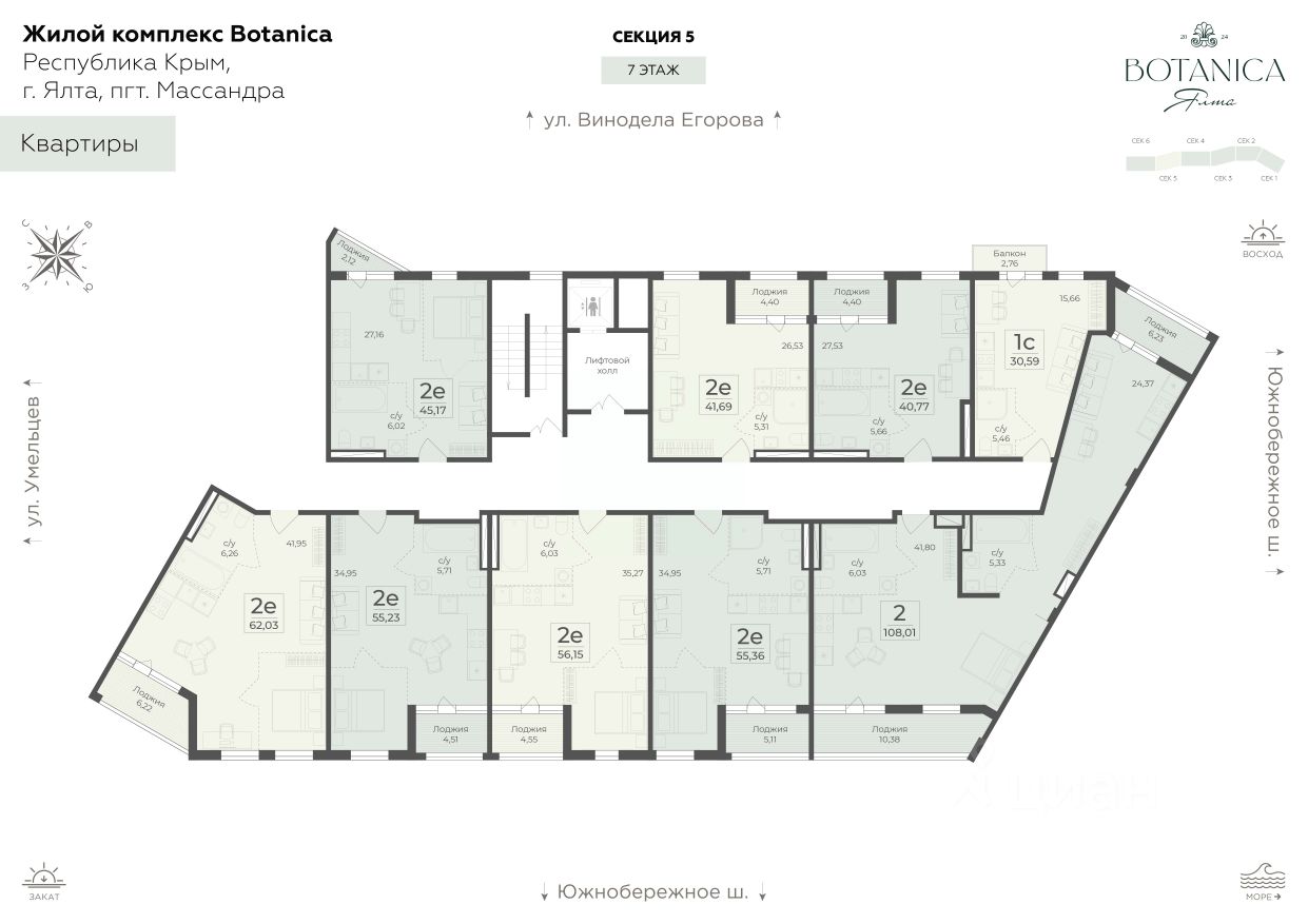 Продаётся 2-комнатная квартира в строящемся доме (Корпус 1 (секция 1, 2)), срок сдачи: I-кв. 2029, общей площадью 48.1 кв.м., на 6 этаже. Новый жилой комплекс ''Botanica'' от застройщика ''Развитие'' расположен по адресу Россия, Республика Крым, городской округ Ялта, посёлок городского типа Массандра, Южнобережное шоссе