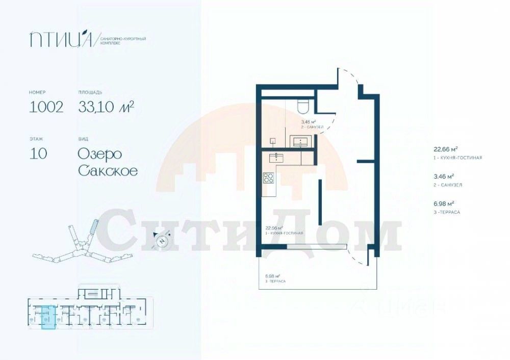 В новом санаторно-курортном комплексе премиум-класса на первой береговой линии ''ПТИЦА'' продаются отличные апартаменты с боковым видом на море! Которые состоят из кухни-гостиной 22,66 м2, совмещенного санузла 3,46 м2 и террасы 6,98 м2. Общая площадь 33,1 м2. СРОК СДАЧИ ДОМА 3 квартал 2028 г. Санаторно-курортный комплекс ПТИЦА — это уникальный комплекс, включающий в себя номерной фонд и собственный санаторный корпус, соединяющий в себе проживание, оздоровление и отдых сервиса 5*. В непосредственной близости к Чёрному морю, ПТИЦА ставит новый акцент, создавая мощный центр притяжения в экологичной локации бальнеологического курорта САКИ. ПТИЦА — это новый взгляд на комфортную среду, в центре которой находится человек, его физическое и ментальное здоровье. Архитектурное решение, в виде здания переменной этажности в форме белой птицы, устремившейся в море, с террасами и эксплуатируемой кровлей производит целостное впечатление, где концепция зданий отражает собственные индивидуальные черты. Это верность традициям, сервис мирового стандарта, и южное гостеприимство. Птица объединяет в себе отдых уровня 5 звезд и оздоровление с применением первоклассной медицины. Индивидуальный подход к каждому гостю и новейшие технологии. ПТИЦА в деталях: - 11 ГА БЛАГОУСТРОЕННОЙ ТЕРРИТОРИИ - 3 ГА ЗАКРЫТОГО ПЛЯЖА - ПЛОЩАДЬ НОМЕРНОГО ФОНДА ОТ 24,16 М2 ДО 345,26 М2 - САНАТОРНЫЙ КОРПУС С МЕДИЦИНСКИМ ОБСЛУЖИВАНИЕМ - SPA-ЦЕНТР 1 960 М2 И БАССЕЙН С МОРСКОЙ ВОДОЙ 700 М2 - ОТКРЫТЫЙ КИНОТЕАТР - КОВОРКИНГ И КОНФЕРЕНЦ ЗАЛ - ДЕТСКИЕ И ВЗРОСЛЫЕ СПОРТИВНЫЕ ПРОСТРАНСТВА - ПАНОРАМНЫЙ РЕСТОРАН НА 16 ЭТАЖЕ Купить апартаменты в ''ПТИЦЕ'' — это идеальное инвестиционное вложение на старте продаж и возможность получать пассивный доход после сдачи комплекса. Международный отельный оператор обеспечит стабильный круглогодичный доход с окупаемостью апартаментов за 5-6 лет. Удивительное сочетание всех удобств в одном месте. АПАРТАМЕНТЫ ПО ЦЕНЕ ЗАСТРОЙЩИКА! БЕЗ ДОПОЛНИТЕЛЬНЫХ КОМИССИЙ ОТ ПОКУПАТЕЛЯ! В продаже имеются другие апартаменты с другими планировками на Ваш выбор! Отличный вариант для инвестиций! Звоните! При звонке сообщите, пожалуйста, номер объекта 2038, чтобы мы могли предоставить вам интересующую информацию оперативно.