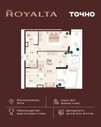 Жилой комплекс ''РОЯЛТА'' включает 5 монолитно-кирпичных девятиэтажных зданий. Проект предлагает квартиры различных планировок: от однокомнатных до трехкомнатных с расширенными балконами и террасами до 13,4 м2. Территория будет благоустроена детскими игровыми и спортивными площадками, гостевой автостоянкой и озеленением, включая газоны, деревья и кустарники. Также появятся современные уличные тренажёры, СПА-комплекс и панорамный инфинити-бассейн. В шаговой доступности находятся центральная набережная Ялты, детские сады, школы, супермаркеты, торговые центры, Ялтинский медицинский колледж, автовокзал и Мордвиновский парк.