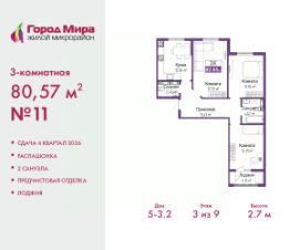 Продается трехкомнатная квартира с предчистовой отделкой в ЖМ ''Город Мира'' на 3 этаже. Общая площадь: 80.57 кв.м., жилая: 45.88 кв.м., площадь просторной кухни-столовой: 12.04 кв.м. Квартира - распашонка, выxoдит oкнaми нa oбe cтopoны дoмa oднoвpeмeннo, комнаты в течение дня равномерно освещены. В квартире одна лоджия, один совмещенный и один раздельный санузел. Высота потолков 2.7 м. Квартиры в ЖК ''Город Мира'' ваш комфорт начинается здесь! ''Город Мира'' это масштабный жилой комплекс, созданный для тех, кто ценит комфорт, безопасность и гармонию с природой. Здесь продумана каждая деталь: от удобной инфраструктуры до эргономичных планировок квартир. В 2024 году микрорайон ''Город Мира'' победил в номинации ''Лучший экологический проект года в сфере строительства'' по версии премии Crimea Urban Awards. Почему выбирают наш комплекс: - Зеленый оазис живите среди природы в черте города.- Всё под рукой 2 детских сада, магазины, фитнес, медицина. - Безопасность: закрытая территория с видеонаблюдением. Наши квартиры: - Просторные планировки с кладовыми. - лоджии с остеклением.- Автономное отопление: платите только за реальное потребление. - Предчистовая отделка, включает стяжку пола, без штукатурки стен. - Консьерж-сервис и подземный паркинг. Инфраструктура комплекса: - Детские и спортивные площадки. - Зоны отдыха с беседками. - Фитнес-клубы и салоны красоты. - Будущая школа на территории, уже функционируют два детских сада. Выгодные условия покупки: - Ипотека от 5,5%, военная ипотека от 5,5%. - Рассрочка. - Материнский капитал на первоначальный взнос. Квартира находится в корпусе 5_3.2. Дом монолитный, одноподъездный, высотой 9 этажей. В подъезде 1 грузовой лифт. Окончание строительства - 4 квартал 2026 года. Оформление сделки по договору долевого участия. #ZMdOef
