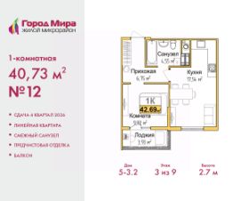 Продается 1-комн. квартира с предчистовой отделкой в ЖМ ''Город Мира'' на 3 этаже. Общая площадь: 40.73 кв.м., жилая: 9.92 кв.м., площадь просторной кухни-столовой: 17.54 кв.м. Все окна выходят на одну сторону. В квартире один балкон, один совмещенный санузел. Высота потолков 2.7 м. Квартиры в ЖК ''Город Мира'' ваш комфорт начинается здесь! ''Город Мира'' это масштабный жилой комплекс, созданный для тех, кто ценит комфорт, безопасность и гармонию с природой. Здесь продумана каждая деталь: от удобной инфраструктуры до эргономичных планировок квартир. В 2024 году микрорайон ''Город Мира'' победил в номинации ''Лучший экологический проект года в сфере строительства'' по версии премии Crimea Urban Awards. Почему выбирают наш комплекс: - Зеленый оазис живите среди природы в черте города.- Всё под рукой 2 детских сада, магазины, фитнес, медицина. - Безопасность: закрытая территория с видеонаблюдением. Наши квартиры: - Просторные планировки с кладовыми. - лоджии с остеклением.- Автономное отопление: платите только за реальное потребление. - Предчистовая отделка, включает стяжку пола, без штукатурки стен. - Консьерж-сервис и подземный паркинг. Инфраструктура комплекса: - Детские и спортивные площадки. - Зоны отдыха с беседками. - Фитнес-клубы и салоны красоты. - Будущая школа на территории, уже функционируют два детских сада. Выгодные условия покупки: - Ипотека от 5,5%, военная ипотека от 5,5%. - Рассрочка. - Материнский капитал на первоначальный взнос. Квартира находится в корпусе 5_3.2. Дом монолитный, одноподъездный, высотой 9 этажей. В подъезде 1 грузовой лифт. Окончание строительства - 4 квартал 2026 года. Оформление сделки по договору долевого участия. #zMD0F0