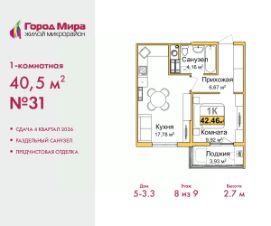 Однокомнатная квартира с предчистовой отделкой в ЖМ ''Город Мира'' на 8 этаже. Общая площадь: 40.5 кв.м., жилая: 9.92 кв.м., площадь просторной кухни-столовой: 17.78 кв.м. Все окна выходят на одну сторону. В квартире один балкон, один совмещенный санузел. Высота потолков 2.7 м. Квартиры в ЖК ''Город Мира'' ваш комфорт начинается здесь! ''Город Мира'' это масштабный жилой комплекс, созданный для тех, кто ценит комфорт, безопасность и гармонию с природой. Здесь продумана каждая деталь: от удобной инфраструктуры до эргономичных планировок квартир. В 2024 году микрорайон ''Город Мира'' победил в номинации ''Лучший экологический проект года в сфере строительства'' по версии премии Crimea Urban Awards. Почему выбирают наш комплекс: - Зеленый оазис живите среди природы в черте города.- Всё под рукой 2 детских сада, магазины, фитнес, медицина. - Безопасность: закрытая территория с видеонаблюдением. Наши квартиры: - Просторные планировки с кладовыми. - Лоджии с остеклением.- Автономное отопление: платите только за реальное потребление. - Предчистовая отделка, включает стяжку пола, без штукатурки стен. - Консьерж-сервис и подземный паркинг. Инфраструктура комплекса: - Детские и спортивные площадки. - Зоны отдыха с беседками. - Фитнес-клубы и салоны красоты. - Будущая школа на территории, уже функционируют два детских сада. Выгодные условия покупки: - Ипотека от 5,5%, военная ипотека от 5,5%. - Рассрочка. - Материнский капитал на первоначальный взнос. Квартира находится в корпусе 5_3.3. Дом монолитный, одноподъездный, высотой 9 этажей. В подъезде 1 грузовой лифт. Окончание строительства - 4 квартал 2026 года. Оформление сделки по договору долевого участия. #z6DOFu