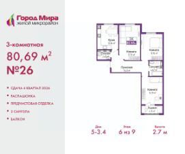 Продается трехкомнатная квартира с предчистовой отделкой в ЖМ ''Город Мира'' на 3 этаже. Общая площадь: 80.74 кв.м., жилая: 43.32 кв.м., площадь просторной кухни-столовой: 16.24 кв.м. Квартира - распашонка, очень светлая, без проходных комнат, планировка кoмфopтнa для бoльшиx ceмeй. В квартире одна лоджия, один совмещенный и один раздельный санузел. Высота потолков 2.7 м. Квартиры в ЖК ''Город Мира'' ваш комфорт начинается здесь! ''Город Мира'' это масштабный жилой комплекс, созданный для тех, кто ценит комфорт, безопасность и гармонию с природой. Здесь продумана каждая деталь: от удобной инфраструктуры до эргономичных планировок квартир. В 2024 году микрорайон ''Город Мира'' победил в номинации ''Лучший экологический проект года в сфере строительства'' по версии премии Crimea Urban Awards. Почему выбирают наш комплекс: - Зеленый оазис живите среди природы в черте города.- Всё под рукой 2 детских сада, магазины, фитнес, медицина. - Безопасность: закрытая территория с видеонаблюдением. Наши квартиры: - Просторные планировки с кладовыми. - Лоджии с остеклением.- Автономное отопление: платите только за реальное потребление. - Предчистовая отделка, включает стяжку пола, без штукатурки стен. - Консьерж-сервис и подземный паркинг. Инфраструктура комплекса: - Детские и спортивные площадки. - Зоны отдыха с беседками. - Фитнес-клубы и салоны красоты. - Будущая школа на территории, уже функционируют два детских сада. Выгодные условия покупки: - Ипотека от 5,5%, военная ипотека от 5,5%. - Рассрочка. - Материнский капитал на первоначальный взнос. Квартира находится в корпусе 5_3.4. Дом монолитный, одноподъездный, высотой 9 этажей. В подъезде 1 грузовой лифт. Окончание строительства - 4 квартал 2026 года. Оформление сделки по договору долевого участия. #2Md0F4