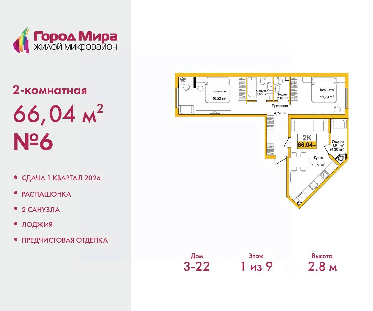 2-комн. квартира от застройщика с предчистовой отделкой в ЖМ ''Город Мира'' на 1 этаже. Общая площадь: 66.04 кв.м., жилая: 30.01 кв.м., площадь просторной кухни-столовой: 18.75 кв.м. Квартира - распашонка, без проходных комнат, окна выходят на paзные стороны дома. В квартире одна лоджия, один совмещенный и один раздельный санузел. Высота потолков 2.8 м. Жилой комплекс ''Город Мира'' комфорт и гармония в современном формате. ''Город Мира'' это масштабный жилой комплекс, созданный для тех, кто ценит комфорт, безопасность и гармонию с природой. Здесь продумана каждая деталь от удобной инфраструктуры до эргономичных планировок квартир. В 2024 году микрорайон ''Город Мира'' победил в номинации ''Лучший экологический проект года в сфере строительства'' по версии премии Crimea Urban Awards. Ключевые преимущества комплекса: - удачное расположение зеленый район с благоприятным микроклиматом - продуманное зонирование жилые кварталы, зоны отдыха и коммерческие объекты - комфорт-класс высокое качество строительства и современные инженерные решения Инфраструктура ''Города Мира'': Образование и досуг: - 2 детских сада (по 260 мест каждый) - планируется строительство общеобразовательной школы - детские и спортивные площадки в каждом дворе - беседки для отдыха, зоны для выгула собак Ритейл и сервис: - магазины, аптеки, медицинские центры - фитнес-клубы, салоны красоты - детские развивающие центры Парковки: - гостевые парковки - наземные и подземные паркинги Квартиры с продуманным комфортом: - просторные планировки с кладовыми и колясочными - лоджии с остеклением - автономное отопление (по 23 дому: индивидуальное отопление) - выполнена стяжка пола (по 3, 4, 20, 21, 22 домам: выполненная стяжка пола и штукатурка стен) - Консьерж-сервис для дополнительного удобства Благоустройство территории: - ландшафтный дизайн с зонами отдыха - современные детские площадки - стильные холлы с дизайнерской отделкой - система видеонаблюдения для безопасности ''Город Мира'' это место, где созданы все условия для комфортной жизни. Выбирайте качество и продуманность в каждой детали! Квартира находится в корпусе 3_22. Дом монолитный, одноподъездный, высотой 9 этажей. В подъезде 1 грузовой лифт. Окончание строительства - 1 квартал 2026 года. Оформление сделки по договору долевого участия. #zsaT5d
