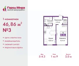 Продается однокомнатная квартира с предчистовой отделкой в ЖМ ''Город Мира'' на 1 этаже. Общая площадь: 46.86 кв.м., жилая: 16.74 кв.м., площадь просторной кухни-столовой: 16.84 кв.м. Все окна выходят на одну сторону. В квартире один совмещенный санузел. Высота потолков 3,0 м. Квартиры в ЖК ''Город Мира'' ваш комфорт начинается здесь! ''Город Мира'' это масштабный жилой комплекс, созданный для тех, кто ценит комфорт, безопасность и гармонию с природой. Здесь продумана каждая деталь: от удобной инфраструктуры до эргономичных планировок квартир. В 2024 году микрорайон ''Город Мира'' победил в номинации ''Лучший экологический проект года в сфере строительства'' по версии премии Crimea Urban Awards. Почему выбирают наш комплекс: - Зеленый оазис живите среди природы в черте города.- Всё под рукой 2 детских сада, магазины, фитнес, медицина. - Безопасность: закрытая территория с видеонаблюдением. Наши квартиры: - Просторные планировки с кладовыми. - Лоджии с остеклением.- Автономное отопление: платите только за реальное потребление. - Предчистовая отделка, включает стяжку пола, без штукатурки стен. - Консьерж-сервис и подземный паркинг. Инфраструктура комплекса: - Детские и спортивные площадки. - Зоны отдыха с беседками. - Фитнес-клубы и салоны красоты. - Будущая школа на территории, уже функционируют два детских сада. Выгодные условия покупки: - Ипотека от 5,5%, военная ипотека от 5,5%. - Рассрочка. - Материнский капитал на первоначальный взнос. Квартира находится в корпусе 5_4.3. Дом монолитный, одноподъездный, высотой 9 этажей. В подъезде 1 грузовой лифт. Окончание строительства - 4 квартал 2026 года. Оформление сделки по договору долевого участия. #ZmglCm