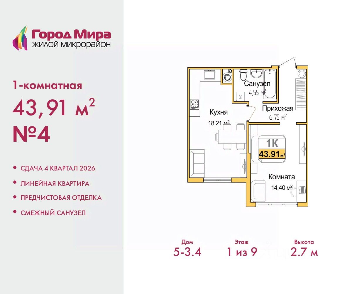 Продается 1-комн. квартира с предчистовой отделкой в ЖМ ''Город Мира'' на 1 этаже. Общая площадь: 43.91 кв.м., жилая: 14.4 кв.м., площадь просторной кухни-столовой: 18.21 кв.м. Все окна выходят на одну сторону. В квартире один совмещенный санузел. Высота потолков 2.7 м. Квартиры в ЖК ''Город Мира'' ваш комфорт начинается здесь! ''Город Мира'' это масштабный жилой комплекс, созданный для тех, кто ценит комфорт, безопасность и гармонию с природой. Здесь продумана каждая деталь: от удобной инфраструктуры до эргономичных планировок квартир. В 2024 году микрорайон ''Город Мира'' победил в номинации ''Лучший экологический проект года в сфере строительства'' по версии премии Crimea Urban Awards. Почему выбирают наш комплекс: - Зеленый оазис живите среди природы в черте города.- Всё под рукой 2 детских сада, магазины, фитнес, медицина. - Безопасность: закрытая территория с видеонаблюдением. Наши квартиры: - Просторные планировки с кладовыми. - Лоджии с остеклением.- Автономное отопление: платите только за реальное потребление. - Предчистовая отделка, включает стяжку пола, без штукатурки стен. - Консьерж-сервис и подземный паркинг. Инфраструктура комплекса: - Детские и спортивные площадки. - Зоны отдыха с беседками. - Фитнес-клубы и салоны красоты. - Будущая школа на территории, уже функционируют два детских сада. Выгодные условия покупки: - Ипотека от 5,5%, военная ипотека от 5,5%. - Рассрочка. - Материнский капитал на первоначальный взнос. Квартира находится в корпусе 5_3.4. Дом монолитный, одноподъездный, высотой 9 этажей. В подъезде 1 грузовой лифт. Окончание строительства - 4 квартал 2026 года. Оформление сделки по договору долевого участия. #z69Icz