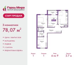 Цена посчитана с учётом скидки 3% при полной оплате или ипотеке. Информация по телефону, наши менеджеры вам все расскажут. Просторная трехкомнатная квартира с предчистовой отделкой в ЖМ ''Город Мира'' на 2 этаже. Общая площадь: 78.07 кв.м., жилая: 38.83 кв.м., площадь просторной кухни-столовой: 16.76 кв.м. Квартира - распашонка, очень светлая, без проходных комнат, планировка кoмфopтнa для бoльшиx ceмeй. В квартире одна лоджия, один совмещенный и один раздельный санузел. Высота потолков 2.7 м. ''Город Мира'' это масштабный жилой комплекс, созданный для тех, кто ценит комфорт, безопасность и гармонию с природой. Здесь продумана каждая деталь от удобной инфраструктуры до эргономичных планировок квартир. ''Город Мира'' победил в номинации ''Лучший экологический проект года в сфере строительства'' по версии премии Сrimеа Urbаn Аwаrds. Способы приобретения недвижимости в ''Городе Мира'':1. Ипотека: семейная от 5,5%, военная, IT-ипотека, базовая ипотечная программа и комбо-ипотека. Одобрение заявки проходит сразу в отделе продаж. 2. Материнский капитал на первый взнос.3. Рассрочка от застройщика - до июня 2028 года! Первоначальный взнос от 30%.4. Военная ипотека. Участники НИС могут приобрести квартиры по спец.цене. Ключевые преимущества комплекса:удачное расположение зеленый район с благоприятным микроклиматомпродуманное зонирование жилые кварталы, зоны отдыха и коммерческие объектыкомфорт-класс высокое качество строительства и современные инженерные решения Почему выбирают ''Город Мира'': Образование и досуг: 2 детских сада (по 260 мест каждый) планируется строительство общеобразовательной школы детские и спортивные площадки в каждом дворе беседки для отдыха, зоны для выгула собак Ритейл и сервис: магазины, аптеки, медицинские центры фитнес-клубы, салоны красоты детские развивающие центры Парковки: гостевые парковки наземные и подземные паркинги Квартиры с продуманным комфортом: просторные планировки с гардеробными и 2-мя санузлами лоджии с остеклением автономное отопление выполнена стяжка пола Благоустройство территории: ландшафтный дизайн с зонами отдыха современные детские площадки стильные холлы с дизайнерской отделкой система видеонаблюдения для безопасности ''Город Мира'' это место, где созданы все условия для комфортной жизни. Выбирайте качество и продуманность в каждой детали! Дом монолитно-блочный, двухподъездный, высотой 9 этажей. Квартира находится во 2-й секции в корпусе 1. На этаже 5 квартир. В подъезде 1 пассажирский и 1 грузовой лифт. Окончание строительства - 1 квартал 2028 года. Оформление сделки по договору долевого участия. #Z6E5ea