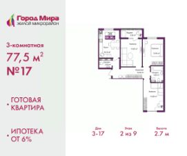 Готовые квартиры. Ипотека от 6%. Информация по телефону, наши менеджеры вам все расскажут. 3-комн. квартира с предчистовой отделкой в ЖМ ''Город Мира'' на 2 этаже. Общая площадь: 77.5 кв.м., жилая: 43.33 кв.м., площадь просторной кухни-столовой: 14.18 кв.м. Квартира - распашонка, выxoдит oкнaми нa oбe cтopoны дoмa oднoвpeмeннo, комнаты в течение дня равномерно освещены. В квартире одна лоджия, один совмещенный и один раздельный санузел. Высота потолков 2.7 м. Жилой комплекс ''Город Мира'' комфорт и гармония в современном формате. ''Город Мира'' это масштабный жилой комплекс, созданный для тех, кто ценит комфорт, безопасность и гармонию с природой. Здесь продумана каждая деталь от удобной инфраструктуры до эргономичных планировок квартир. В 2024 году микрорайон ''Город Мира'' победил в номинации ''Лучший экологический проект года в сфере строительства'' по версии премии Crimea Urban Awards. Ключевые преимущества комплекса:- удачное расположение зеленый район с благоприятным микроклиматом- продуманное зонирование жилые кварталы, зоны отдыха и коммерческие объекты- комфорт-класс высокое качество строительства и современные инженерные решения Инфраструктура ''Города Мира'': Образование и досуг:- 2 детских сада (по 260 мест каждый)- планируется строительство общеобразовательной школы- детские и спортивные площадки в каждом дворе- беседки для отдыха, зоны для выгула собак Ритейл и сервис:- магазины, аптеки, медицинские центры- фитнес-клубы, салоны красоты- детские развивающие центры Парковки:- гостевые парковки- наземные и подземные паркинги Квартиры с продуманным комфортом:- просторные планировки с кладовыми и колясочными- лоджии с остеклением- автономное отопление (по 23 дому: индивидуальное отопление)- выполнена стяжка пола (по 3, 4, 20, 21, 22 домам: выполненная стяжка пола и штукатурка стен) - Консьерж-сервис для дополнительного удобства Благоустройство территории:- ландшафтный дизайн с зонами отдыха- современные детские площадки- стильные холлы с дизайнерской отделкой- система видеонаблюдения для безопасности ''Город Мира'' это место, где созданы все условия для комфортной жизни. Выбирайте качество и продуманность в каждой детали! Квартира находится в корпусе 3_17. Дом монолитный, одноподъездный, высотой 9 этажей. В подъезде 1 грузовой лифт. В настоящее время строительство завершено, дом сдан в 4 квартале 2024 года. Оформление сделки по договору купли-продажи. #zm23Zm