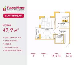 Цена посчитана с учётом скидки 3% при полной оплате или ипотеке. Информация по телефону, наши менеджеры вам все расскажут. Двухкомнатная квартира с европланировкой и предчистовой отделкой в ЖМ ''Город Мира'' на 13 этаже. Общая площадь: 50.2 кв.м., жилая: 24.9 кв.м., суммарная площадь гостиной-столовой с кухонной зоной: 20.3 кв.м. Европейская планировка, кухня-гостиная - идеальный вариант для тех, кто любит часто принимать гостей. Угловая квартира, очень светлая, естественная вентиляция при открытии окон. В квартире одна лоджия, один совмещенный санузел. Высота потолков 2.7 м. ''Город Мира'' это масштабный жилой комплекс, созданный для тех, кто ценит комфорт, безопасность и гармонию с природой. Здесь продумана каждая деталь от удобной инфраструктуры до эргономичных планировок квартир. ''Город Мира'' победил в номинации ''Лучший экологический проект года в сфере строительства'' по версии премии Сrimеа Urbаn Аwаrds. Способы приобретения недвижимости в ''Городе Мира'':1. Ипотека: семейная от 5,5%, военная, IT-ипотека, базовая ипотечная программа и комбо-ипотека. Одобрение заявки проходит сразу в отделе продаж. 2. Материнский капитал на первый взнос.3. Рассрочка от застройщика - до июня 2028 года! Первоначальный взнос от 30%.4. Военная ипотека. Участники НИС могут приобрести квартиры по спец.цене. Ключевые преимущества комплекса:удачное расположение зеленый район с благоприятным микроклиматомпродуманное зонирование жилые кварталы, зоны отдыха и коммерческие объектыкомфорт-класс высокое качество строительства и современные инженерные решения Почему дом повышенной комфортности 2 в ''Городе Мира'' это лучшее решение? Образование и досуг: 2 детских сада (по 260 мест каждый) планируется строительство общеобразовательной школы детские и спортивные площадки в каждом дворе беседки для отдыха, зоны для выгула собак Ритейл и сервис: магазины, аптеки, медицинские центры фитнес-клубы, салоны красоты детские развивающие центры Парковки: гостевые парковки наземные и подземные паркинги Квартиры с продуманным комфортом: просторные планировки с кладовыми и колясочными лоджии с остеклением лапомойки для питомцев на первых этажах домов индивидуальное отопление выполнена стяжка пола и штукатурка стен консьерж-сервис для дополнительного удобства Благоустройство территории: ландшафтный дизайн с зонами отдыха современные детские площадки стильные холлы с дизайнерской отделкой система видеонаблюдения для безопасности ''Город Мира'' это место, где созданы все условия для комфортной жизни. Выбирайте качество и продуманность в каждой детали! Квартира находится во доме повышенной комфортности 2, 4-я очередь. Дом монолитно-каркасный, одноподъездный, высотой 16 этажей. В подъезде 1 пассажирский и 1 грузовой лифт. Окончание строительства - 2 квартал 2028 года. Оформление сделки по договору долевого участия. Квартира находится в корпусе 2. Дом монолитный, одноподъездный, высотой 16 этажей. На этаже 7 квартир. В подъезде 1