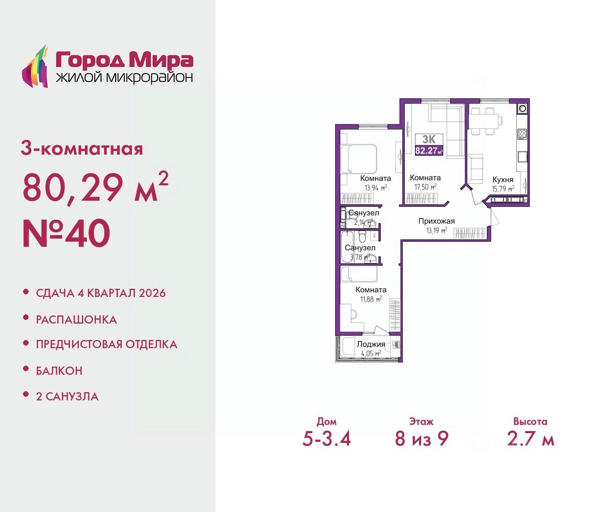 Цена посчитана с учётом скидки 3% при полной оплате или ипотеке. По всем вопросам обращайтесь в офис продаж, наши менеджеры вам все расскажут. Трехкомнатная квартира от застройщика в ЖМ ''Город Мира'' на 3 этаже. Общая площадь: 77.9 кв.м. Высота потолков 2.7 м. Дом монолитно-блочный, двухподъездный, высотой 9 этажей. Квартира находится во 2-й секции в корпусе 1. На этаже 5 квартир. В подъезде 1 пассажирский и 1 грузовой лифт. Окончание строительства - 1 квартал 2028 года. Оформление сделки по договору долевого участия. #zmEsE8