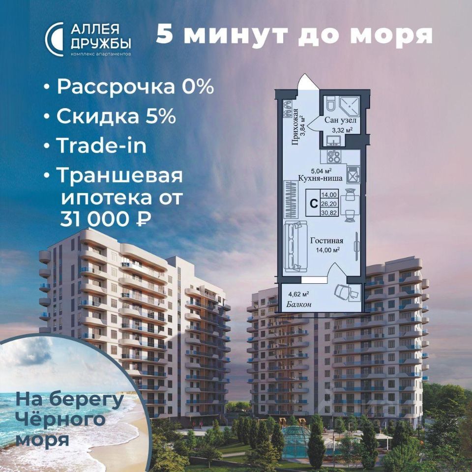ЗВОНИТЕ ПРЯМО СЕЙЧАС, ЧТОБЫ ПОЛУЧИТЬ ВЫГОДУ ДО 650 000 руб! Цена указана со скидкой 5% при условии 100% оплаты либо ипотека. АКЦИИ: * Ипотека от 14,7% * ТРАНШЕВАЯ ИПОТЕКА - ПВ от 20%, платежи от 31000 в месяц * Рассрочка 0% до 2028г. ПВ от 20% * Скидка 5% * Бронь на 30 дней * 5 мин до моря пешком, планировки от 30 кв.м. * Высота потолков 3 м , предчистовая и чистовая отделка * Ипотека от СБЕРБАНКА * Доходность инвестиций от 30% годовых. * Сдача в аренду от управляющей компании (доверительное управление) позволяет получать доход от сдачи апартаментов без вашего участия * Безопасная сделка по ФЗ-214/эскроу-счёта ''Аллея Дружбы'' — это комплекс апартаментов бизнес-класса в Евпатории, расположенный в 5 минутах прогулки от золотистых пляжей Чёрного моря. Два современных 12-этажных корпуса с панорамными видами на море объединены стильным стилобатом с центральным входом и бутиковыми retail-площадями, а закрытая территория и подземный паркинг обеспечивает приватность и безопасность. АРХИТЕКТУРА И КОНСТРУКТИВНЫЕ ОСОБЕННОСТИ: •12-этажное здание в авторском архитектурном стиле •Высота потолков (от 2,9 м до 3,1 м) •Эксклюзивное решение для первых этажей (высота потолков 3,4м) •Евро планировки с террасами и гардеробными •Панорамное ламинированное остекление •Индивидуальные келлеры •Видовые лоты на море •Высокоскоростные лифты по концепции 5* отеля •Предусмотрено резервное электроснабжение •По проекту предусмотрено место для кондиционера и практическое решение для маскировки коммуникаций ЛОКАЦИЯ И ОКРУЖЕНИЕ: •До центра Евпатории - 7 минут на машине •Пляж - всего 5 минут пешком •Рядом с комплексом развитая инфраструктура (рестораны, магазины, кафе, медицинские учреждения, санатории) ГОСТЕПРИИМСТВО И БЕЗУПРЕЧНЫЕ СЕРВИСЫ: •Управляющая компания премиум-класса •Консъерж-сервис 24/7 •Доставки продуктов и готовой еды •Зона ресепшн оформлена в стилистике комплекса •Лобби с атмосферным кафе и зонами для чтения •Премиальное решение для мест общего пользования •Интерактивная детская комната для самых маленьких •Пункты выдачи товаров от маркетплейсов •Гостевые парковочные места •Организовано место для хранения колясок ваших малышей •Ремонт на выбор ''Комфорт-формат'' и ''Гранд-формат'' БЕЗОПАСНОСТЬ И ТЕХНОЛОГИИ СПОКОЙСТВИЯ: •Закрытая территория, двор без машин •Система контроля доступа (строго по электронным пропускам) •Подземный паркинг с тремя типами машиномест •Выделенные места для велосипедов •Камеры видеонаблюдения •Круглосуточный ресепшн •Телеметрия - автоматический сбор и передача данных с приборов учета апартамента минимизирует ошибки и мошенничество •Система умного апартамента с дистанционным управлением БЛАГОУСТРОЙСТВО ТЕРРИТОРИИ: •Ландшафтный дизайн по проекту (2 334 м² озеленения) •Прогулочные аллеи и зоны отдыха для расслабления и медитации •Коворкинг-зоны с высокоскоростным Wi-Fi для бизнес-переговоров •Детские и спортивные площадки •В апарт-комплексе вас ждут мини-маркет и магазин повседневных товаров