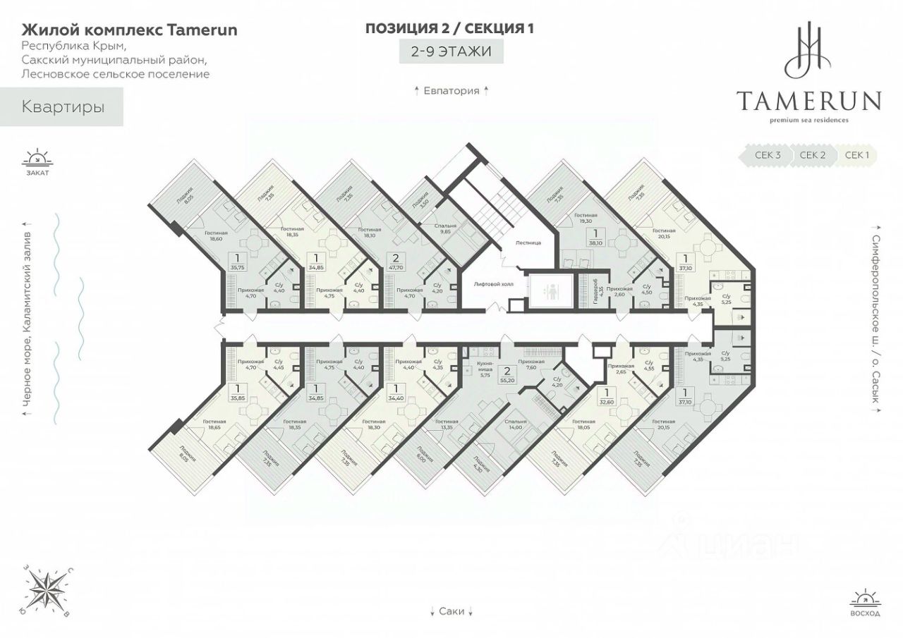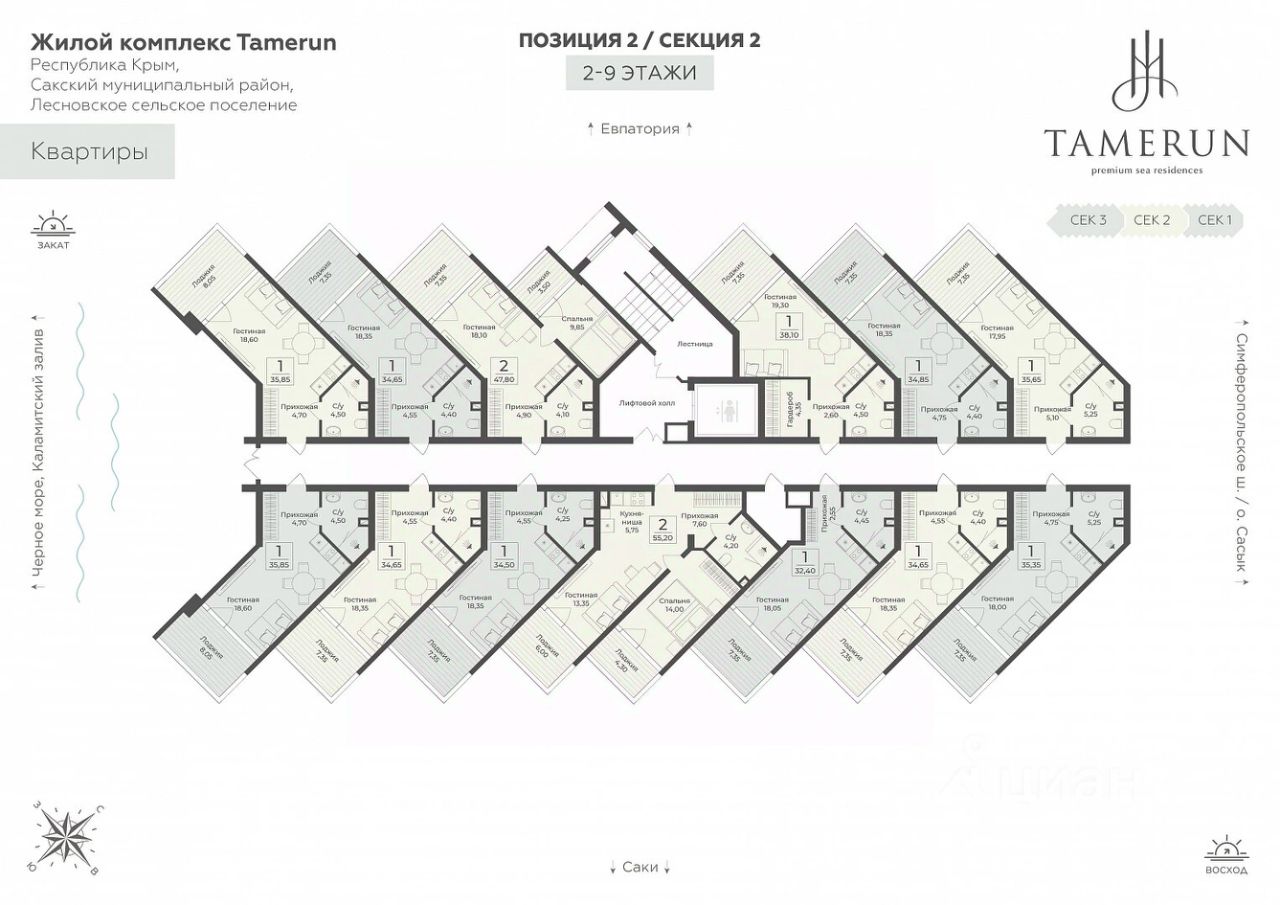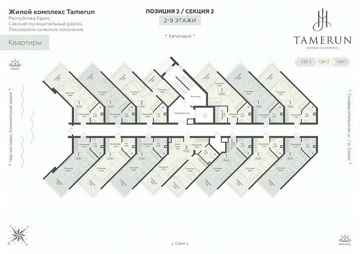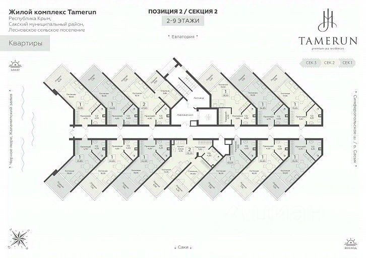 ''Tamerun'' - морская резиденция на Западном берегу Крыма, между городами Евпатория и Саки. Резиденция ''Tamerun'' представляет собой современный комплекс из четырёх корпусов высотой 9 и 12 этажей, гармонично вписанных в живописный ландшафт. Интерьеры выполнены в изысканном элегантном стиле с применением премиальных материалов — натурального мрамора, ценных пород дерева и высококачественной кожи. Просторные помещения наполнены естественным светом благодаря большим панорамным окнам, открывающим завораживающие виды на Черное море. Атмосфера резиденции пропитана уютом и гармонией, создавая идеальные условия для комфортной жизни и отдыха. Рядом с ''Tamerun'' находится Сасыкский заказник и самое крупное в Крыму солёное розовое озеро Сасык-Сиваш. На территории резиденции находится открытый бассейн с подогревом, окружённый шезлонгами и зоной отдыха, где можно наслаждаться теплыми лучами солнца и свежим морским бризом. Для любителей активного отдыха предусмотрен теннисный корт и фитнес-зал, оборудованный новейшими тренажёрами. В солнечной резиденции есть всё для жизни и интересного отдыха: собственный песчаный пляж и теннисный корт, бассейны с морской водой, рестораны и летнее кафе, зона СПА и фитнес-центр, общественно-деловые пространства и подземный паркинг. Профессиональная сервисная компания с международным опытом возьмёт на себя все операционные вопросы по управлению и эксплуатации, обеспечивая 5-звёздочный уровень обслуживания.