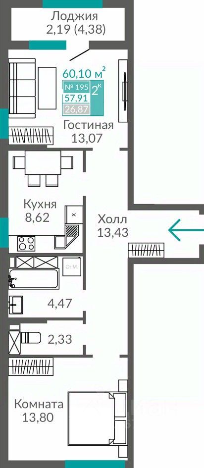 57 м² · Этаж 8 из 16
