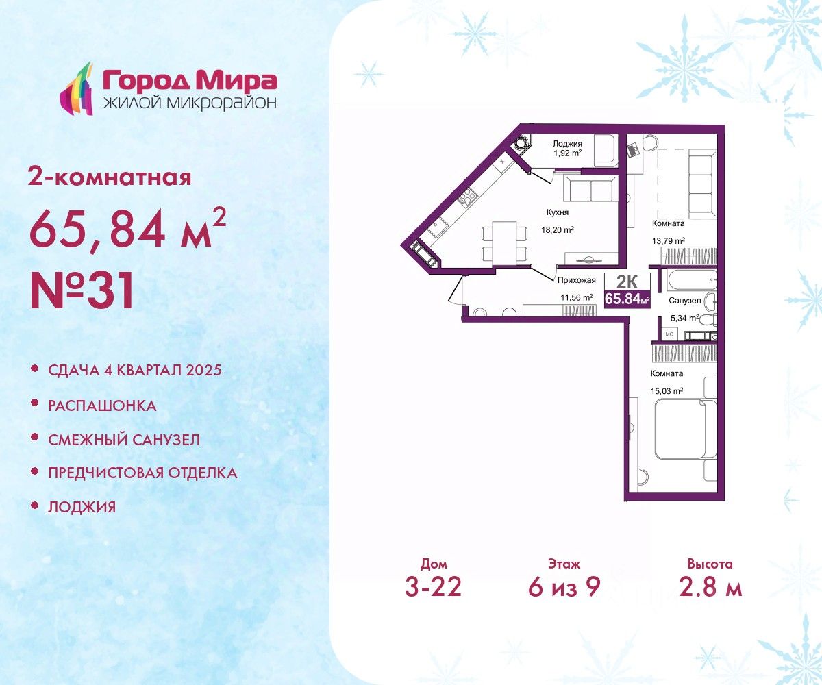 2-комн. квартира от застройщика с предчистовой отделкой в ЖМ ''Город Мира'' на 6 этаже. Общая площадь: 65.84 кв.м., жилая: 28.82 кв.м., площадь просторной кухни-столовой: 18.2 кв.м. Квартира - распашонка, без проходных комнат, окна выходят на paзные стороны дома. В квартире одна лоджия, один совмещенный санузел. Высота потолков 2.8 м. Жилой комплекс ''Город Мира'' комфорт и гармония в современном формате. ''Город Мира'' это масштабный жилой комплекс, созданный для тех, кто ценит комфорт, безопасность и гармонию с природой. Здесь продумана каждая деталь от удобной инфраструктуры до эргономичных планировок квартир. В 2024 году микрорайон ''Город Мира'' победил в номинации ''Лучший экологический проект года в сфере строительства'' по версии премии Crimea Urban Awards. Ключевые преимущества комплекса: - удачное расположение зеленый район с благоприятным микроклиматом - продуманное зонирование жилые кварталы, зоны отдыха и коммерческие объекты - комфорт-класс высокое качество строительства и современные инженерные решения Инфраструктура ''Города Мира'': Образование и досуг: - 2 детских сада (по 260 мест каждый) - планируется строительство общеобразовательной школы - детские и спортивные площадки в каждом дворе - беседки для отдыха, зоны для выгула собак Ритейл и сервис: - магазины, аптеки, медицинские центры - фитнес-клубы, салоны красоты - детские развивающие центры Парковки: - гостевые парковки - наземные и подземные паркинги Квартиры с продуманным комфортом: - просторные планировки с кладовыми и колясочными - автономное отопление (по 23 дому: индивидуальное отопление) - выполнена стяжка пола (по 3, 4, 20, 21, 22 домам: выполненная стяжка пола и штукатурка стен) - Консьерж-сервис для дополнительного удобства Благоустройство территории: - ландшафтный дизайн с зонами отдыха - современные детские площадки - стильные холлы с дизайнерской отделкой - система видеонаблюдения для безопасности ''Город Мира'' это место, где созданы все условия для комфортной жизни. Выбирайте качество и продуманность в каждой детали! Квартира находится в корпусе 3_22. Дом монолитный, одноподъездный, высотой 9 этажей. В подъезде 1 грузовой лифт. Окончание строительства - 4 квартал 2025 года. Оформление сделки по договору долевого участия. #zSsg77