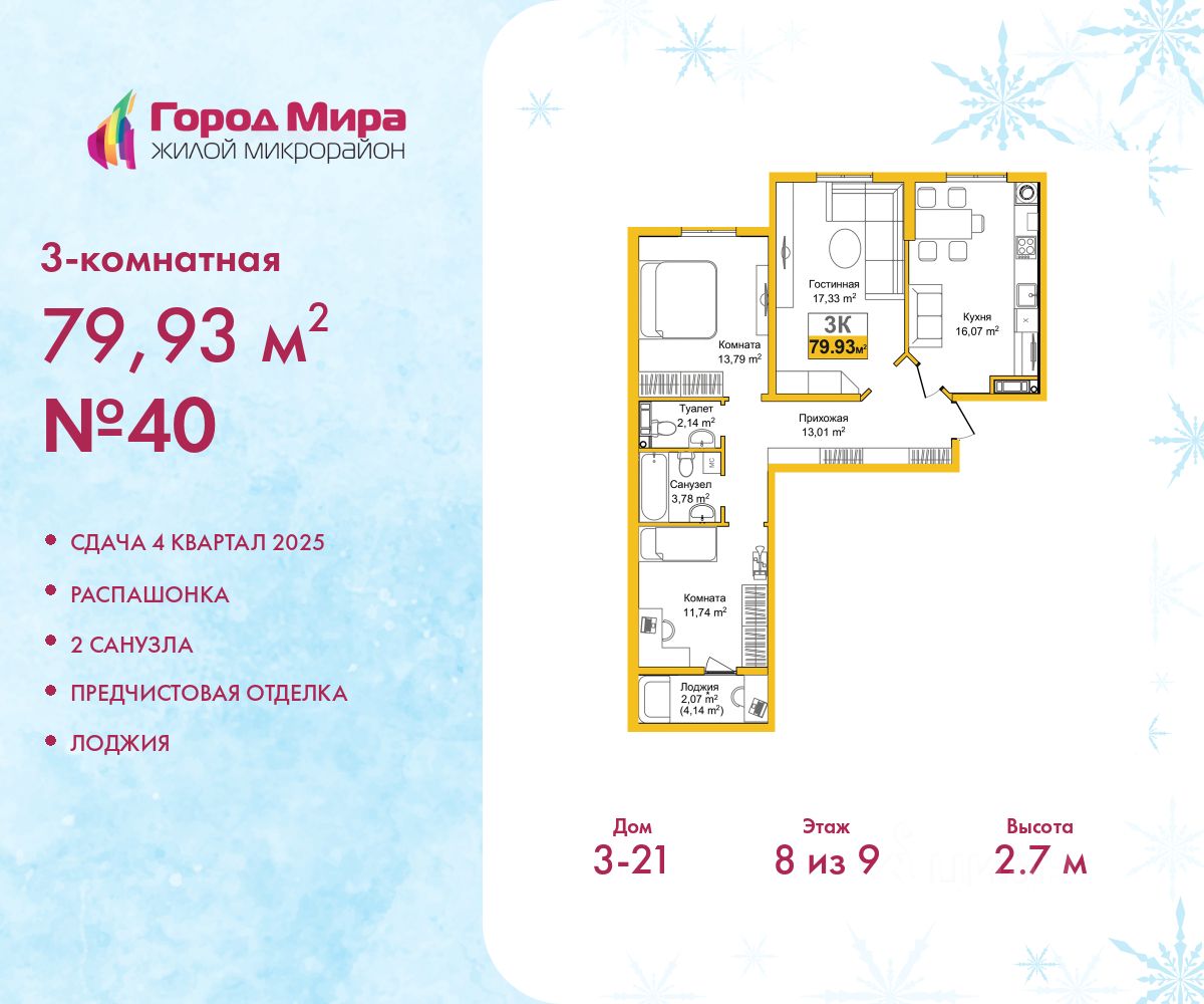 Трехкомнатная квартира от застройщика с предчистовой отделкой в ЖМ ''Город Мира'' на 8 этаже. Общая площадь: 79.93 кв.м., жилая: 42.86 кв.м., площадь просторной кухни-столовой: 16.07 кв.м. Квартира - распашонка, без проходных комнат, окна выходят на paзные стороны дома. В квартире одна лоджия, один совмещенный и один раздельный санузел. Высота потолков 2.7 м. Жилой комплекс ''Город Мира'' комфорт и гармония в современном формате. ''Город Мира'' это масштабный жилой комплекс, созданный для тех, кто ценит комфорт, безопасность и гармонию с природой. Здесь продумана каждая деталь от удобной инфраструктуры до эргономичных планировок квартир. В 2024 году микрорайон ''Город Мира'' победил в номинации ''Лучший экологический проект года в сфере строительства'' по версии премии Crimea Urban Awards. Ключевые преимущества комплекса: - удачное расположение зеленый район с благоприятным микроклиматом - продуманное зонирование жилые кварталы, зоны отдыха и коммерческие объекты - комфорт-класс высокое качество строительства и современные инженерные решения Инфраструктура ''Города Мира'': Образование и досуг: - 2 детских сада (по 260 мест каждый) - планируется строительство общеобразовательной школы - детские и спортивные площадки в каждом дворе - беседки для отдыха, зоны для выгула собак Ритейл и сервис: - магазины, аптеки, медицинские центры - фитнес-клубы, салоны красоты - детские развивающие центры Парковки: - гостевые парковки - наземные и подземные паркинги Квартиры с продуманным комфортом: - просторные планировки с кладовыми и колясочными - автономное отопление (по 23 дому: индивидуальное отопление) - выполнена стяжка пола (по 3, 4, 20, 21, 22 домам: выполненная стяжка пола и штукатурка стен) - Консьерж-сервис для дополнительного удобства Благоустройство территории: - ландшафтный дизайн с зонами отдыха - современные детские площадки - стильные холлы с дизайнерской отделкой - система видеонаблюдения для безопасности ''Город Мира'' это место, где созданы все условия для комфортной жизни. Выбирайте качество и продуманность в каждой детали! Квартира находится в корпусе 3_21. Дом монолитный, одноподъездный, высотой 9 этажей. В подъезде 1 грузовой лифт. Окончание строительства - 4 квартал 2025 года. Оформление сделки по договору долевого участия. #2mSF6c
