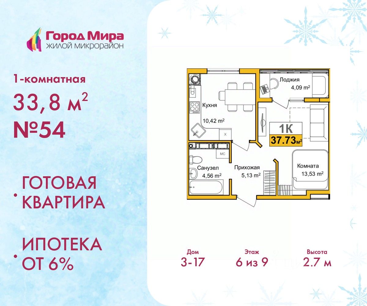 Готовые квартиры. Ипотека от 6%. По всем вопросам звоните в офис продаж, мы вам все подробно расскажем! Однокомнатная квартира с предчистовой отделкой в ЖМ ''Город Мира'' на 6 этаже. Общая площадь: 33.8 кв.м., жилая: 13.53 кв.м., площадь просторной кухни-столовой: 10.42 кв.м. Все окна выходят на одну сторону. В квартире одна лоджия, один совмещенный санузел. Высота потолков 2.7 м. ''Город Мира'' это масштабный жилой комплекс, созданный для тех, кто ценит комфорт, безопасность и гармонию с природой. Здесь продумана каждая деталь от удобной инфраструктуры до эргономичных планировок квартир. Главные преимущества: Удачное расположение зеленый район с благоприятным микроклиматом Продуманное зонирование жилые кварталы, зоны отдыха и коммерческие объекты Комфорт-класс высокое качество строительства и современные инженерные решения Инфраструктура Города Мира Образование и досуг: 2 детских сада (по 260 мест каждый) Планируется строительство общеобразовательной школы Детские и спортивные площадки в каждом дворе Беседки для отдыха, зоны для выгула собак Торговля и сервис: Магазины, аптеки, медицинские центры Фитнес-клубы, салоны красоты Детские развивающие центры Парковки: Гостевые парковки Наземные и подземные паркинги Квартиры с продуманным комфортом Особенности жилья: Просторные планировки с кладовыми и колясочными Автономное отопление Выполнена стяжка пола Консьерж-сервис для дополнительного удобства Благоустройство территории: Ландшафтный дизайн с зонами отдыха Современные детские площадки Стильные холлы с дизайнерской отделкой Система видеонаблюдения для безопасности Квартира находится в корпусе 3_17. Дом монолитный, одноподъездный, высотой 9 этажей. В подъезде 1 грузовой лифт. Строительство окончено, дом сдан в 4 квартале 2024 года. Оформление сделки по договору купли-продажи. #2M8fVE