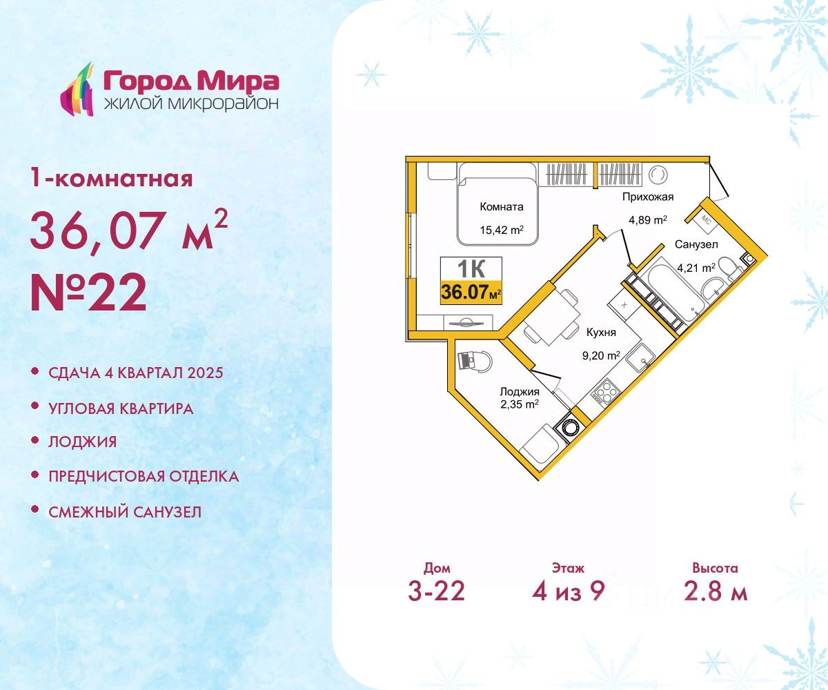 Продается однокомнатная квартира от застройщика с предчистовой отделкой в ЖМ ''Город Мира'' на 4 этаже. Общая площадь: 36.07 кв.м., жилая: 15.42 кв.м., площадь просторной кухни-столовой: 9.2 кв.м. Квартира угловая, идеально подойдет любителям тишины и панорамных видов. В квартире одна лоджия, один совмещенный санузел. Высота потолков 2.8 м. Жилой комплекс ''Город Мира'' комфорт и гармония в современном формате. ''Город Мира'' это масштабный жилой комплекс, созданный для тех, кто ценит комфорт, безопасность и гармонию с природой. Здесь продумана каждая деталь от удобной инфраструктуры до эргономичных планировок квартир. В 2024 году микрорайон ''Город Мира'' победил в номинации ''Лучший экологический проект года в сфере строительства'' по версии премии Crimea Urban Awards. Ключевые преимущества комплекса: - удачное расположение зеленый район с благоприятным микроклиматом - продуманное зонирование жилые кварталы, зоны отдыха и коммерческие объекты - комфорт-класс высокое качество строительства и современные инженерные решения Инфраструктура ''Города Мира'': Образование и досуг: - 2 детских сада (по 260 мест каждый) - планируется строительство общеобразовательной школы - детские и спортивные площадки в каждом дворе - беседки для отдыха, зоны для выгула собак Ритейл и сервис: - магазины, аптеки, медицинские центры - фитнес-клубы, салоны красоты - детские развивающие центры Парковки: - гостевые парковки - наземные и подземные паркинги Квартиры с продуманным комфортом: - просторные планировки с кладовыми и колясочными - автономное отопление (по 23 дому: индивидуальное отопление) - выполнена стяжка пола (по 3, 4, 20, 21, 22 домам: выполненная стяжка пола и штукатурка стен) - Консьерж-сервис для дополнительного удобства Благоустройство территории: - ландшафтный дизайн с зонами отдыха - современные детские площадки - стильные холлы с дизайнерской отделкой - система видеонаблюдения для безопасности ''Город Мира'' это место, где созданы все условия для комфортной жизни. Выбирайте качество и продуманность в каждой детали! Квартира находится в корпусе 3_22. Дом монолитный, одноподъездный, высотой 9 этажей. В подъезде 1 грузовой лифт. Окончание строительства - 4 квартал 2025 года. Оформление сделки по договору долевого участия. #zmVDWD