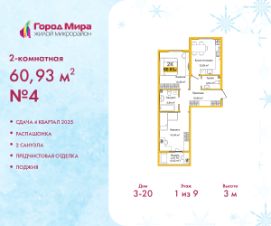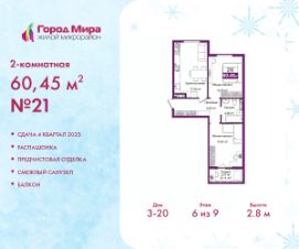 Готовые квартиры. Ипотека от 6%. По всем вопросам обращайтесь в офис продаж, мы вам все подробно расскажем! 2-комн. квартира с предчистовой отделкой в ЖМ ''Город Мира'' на 7 этаже. Общая площадь: 59.7 кв.м., жилая: 21.77 кв.м., площадь просторной кухни-столовой: 19.71 кв.м. Комнаты изолированные, все окна выходят на одну сторону. В квартире один балкон, два совмещенных санузла. Высота потолков 2.7 м. ''Город Мира'' это масштабный жилой комплекс, созданный для тех, кто ценит комфорт, безопасность и гармонию с природой. Здесь продумана каждая деталь от удобной инфраструктуры до эргономичных планировок квартир. Главные преимущества:Удачное расположение зеленый район с благоприятным микроклиматомПродуманное зонирование жилые кварталы, зоны отдыха и коммерческие объектыКомфорт-класс высокое качество строительства и современные инженерные решения Инфраструктура Города МираОбразование и досуг:2 детских сада (по 260 мест каждый)Планируется строительство общеобразовательной школыДетские и спортивные площадки в каждом двореБеседки для отдыха, зоны для выгула собак Торговля и сервис:Магазины, аптеки, медицинские центрыФитнес-клубы, салоны красотыДетские развивающие центры Парковки:Гостевые парковкиНаземные и подземные паркинги Квартиры с продуманным комфортом Особенности жилья:Просторные планировки с кладовыми и колясочнымиАвтономное отоплениеВыполнена стяжка полаКонсьерж-сервис для дополнительного удобства Благоустройство территории:Ландшафтный дизайн с зонами отдыхаСовременные детские площадкиСтильные холлы с дизайнерской отделкойСистема видеонаблюдения для безопасности Квартира находится в корпусе 3_17. Дом монолитный, одноподъездный, высотой 9 этажей. В подъезде 1 грузовой лифт. Строительство завершено, дом сдан в 4 квартале 2024 года. Оформление сделки по договору купли-продажи. #26232t
