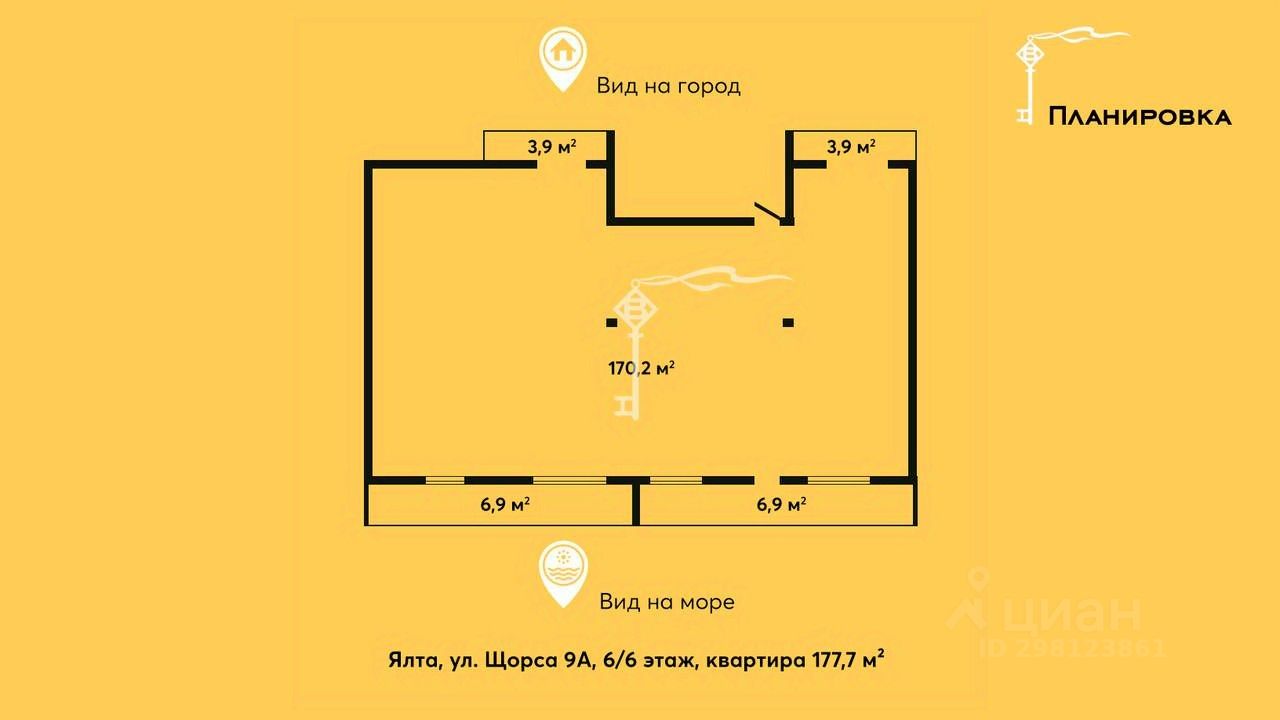 Светлая и просторная квартира свободной планировки в центре Ялты. Предлагаем вашему вниманию просторную квартиру, идеально подходящую под инвестиционные цели, располагающуюся в самом центре Ялты на ул. Щорса 9А. Площадь: -Общая площадь 177,7 м², -Площадь внутренних помещений 170,2 м², -Площадь балконов: 2 балкона по 6,9 м² и 2 балкона по 3,9 м² (по коэффициенту 0,3). Преимущества квартиры: -Располагается в тихом зеленом районе парковой зоны Ялты, при этом всего в 12 минутах ходьбы до знаменитой ялтинской набережной с ее достопримечательностями, кафе, ресторанами, пляжами и местами культурного отдыха и развлечений. -Новый дом клубного типа, сдан в эксплуатацию, почти все квартиры заселены, никто не потревожит ремонтными работами. -Планировка свободная. Квартиру можно спланировать как целиком, так и поделить на 2-4 инвестиционные квартиры, спрос на которые крайне востребован в центре города. -Большие панорамные окна и балконы с обеих сторон квартиры, что также позволяет свободно распоряжаться планировкой и поделить квартиру на 2-4 инвестиционные квартиры. Из окон и балконов открываются впечатляющие панорамные виды на Ялту, Ялтинский залив (с юго-западной стороны), красивый старинный парк и Крымские горы (с северо-восточной стороны). Здесь невозможно строительство других объектов недвижимости, что гарантирует прекрасный вид навсегда. -В самой высокой точке высота потолков достигает 4.2 м, что позволяет использовать это пространство под антресоли. -Проведены все коммуникации: газ, электричество, вода, канализация. -Двухконтурный газовый котёл, что позволяет всегда использовать индивидуальное отопление. -Резервный накопитель воды в доме. -Вход в подъезд с обеих сторон дома. С одной из сторон вход ведет сразу на 3 этаж, т.е., чтобы попасть в квартиру, необходимо подняться всего 3 этажа. -Собственная открытая наземная парковка с большим количеством машиномест, всегда есть свободные места припарковать и хранить свой автомобиль. Инфраструктура: -закрытая территория, -круглосуточная охрана, видеонаблюдение, собственный пост охраны, -открытая парковка, -детская площадка. По соседству с домом располагаются три детских сада, школа. Дом окружен старинными поместьями, памятниками истории и архитектуры. В пешей доступности с домом остановка общественного транспорта, городская поликлиника, магазины, торговые центры, продуктовый рынок, рестораны, театр, кинотеатр. До набережной Ялты всего 12 минут прогулочным шагом. Не упустите интересное инвестиционное предложение, звоните! Будем рады ответить на интересующие вопросы и расскажем о всех инвестиционных преимуществах этого объекта. Добавьте объявление в избранное, чтобы не потерять и следить за обновлением цены. Звоните! Мы всегда на связи.