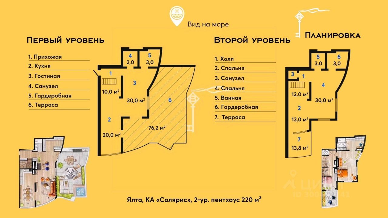 Лучшее предложение сезона пентхаус с большими террасами с видом на море в комплексе премиум-класса Актер парк-отель. Комплекс расположен в живописном уголке Ялты, в двух километрах от центра города и пользуется большим спросом среди статусных покупателей. Это единственный комплекс в Ялте, обладающий собственным закрытым пляжем, расположенный на первой линии у самого моря. Пентхаус площадью 260 кв.м. в двух уровнях и расположен на на самом высоком 9 этаже корпуса Вилла Чайка откуда открывается красивейший вид на парк, горы и море. Особое достоинство апартамента две большие террасы. Отличное место, где можно: + взбодриться чашечкой кофе и позавтракать утром + позагорать на шезлонгах под южным ласковым солнцем + насладиться бокалом Крымского вина вечером Планировка пентхауса удобная и функциональная. Первый уровень: + гостиная, совмещенная с кухней-столовой + изолированную спальню с собственным санузлом + гостевая спальня + большая терраса с выходом из каждой комнаты + гостевой санузел + прихожая + холл Второй уровень: + мастер спальня с персональным санузлом + гардеробная + мини-кухня + большая видовая терраса В пентхаусе выполнена предчистовая отделка возведены межкомнатные перегородки, выполнена стяжка пола по маякам, разведены коммуникации электричество, вода и канализация, отопление и система канального кондиционирования. Инфраструктура дома для роскошного отдыха: + три собственных пляжа + круглый год работает открытый подогреваемый бассейн с джакузи и детской зоной + SPA-центр + тренажерный зал + парк + кафе + винный бар + детская и спортивная площадки + парковка + многоуровневый паркинг Рядом старинный благоустроенный Массандровский парк отличное место для прогулок. Комплекс оснащен централизованными системами безопасности, отопления, и кондиционирования. Актер Парк отель является здравницей Союза театральных деятелей России, поэтому теплыми летними вечерами вы сможете не только комфортно отдохнуть, но и погрузиться в мир искусства, встретить знаменитых актеров театра и кино, а также насладиться постановками в летнем театре под открытым небом.