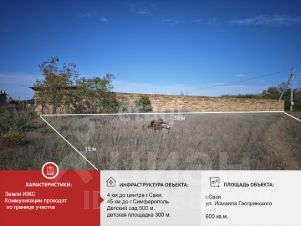 Продается земельный участок в городе Саки!Участок угловой, 6 соток расположен на жилой улице.Ровный, без дополнительных построек и насаждений.Все необходимые коммуникации (газ, свет, вода) проходят по границе участка.Подъездные пути грунтовая дорога. Район активно застраивается, соседи построились и живут круглый год.В районе построили новый детский сад. Магазины, школы, больницы, кафе в центре города.Дополнительно оплачивается комиссия покупателем 2.5%, но не менее 70 000 рублей.Автобусы ходят регулярно в центр города.До центра города 2 км, до моря 7 км.Дополнительно оплачивается комиссия покупателем.При звонке сообщите, пожалуйста, номер объекта 3027, чтобы мы могли предоставить вам интересующую информацию оперативно.